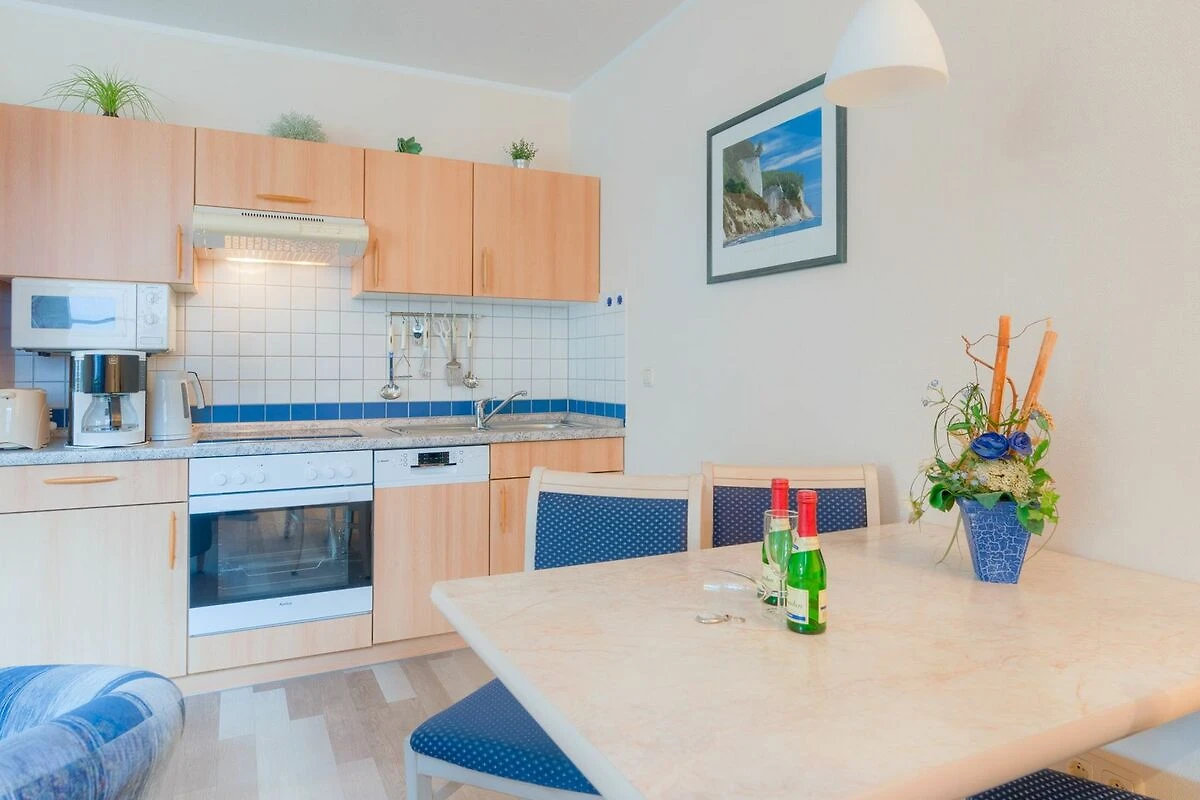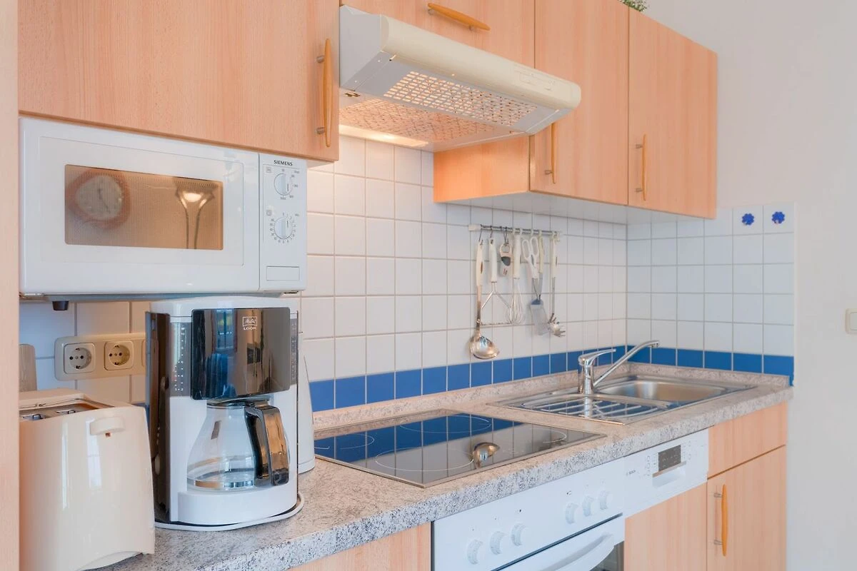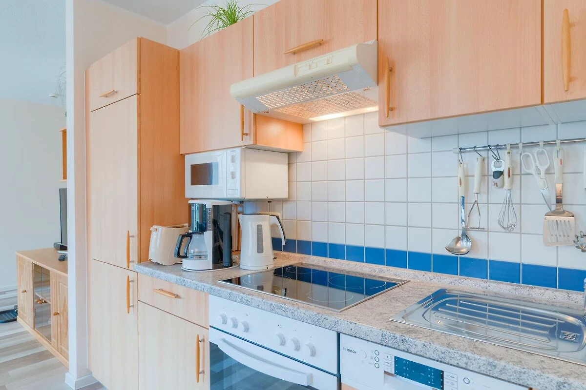 Die hier angrenzende Küchenzeile ist mit einem Kühlschrank mit Gefrierfach, einem Geschirrspüler, einem Backofen mit Cerankochfeld und einer Mikrowelle ausgestattet. Eine Kaffeemaschine, ein Toaster und ein Wasserkocher stehen Ihnen hier selbstverständlich zur Verfügung.