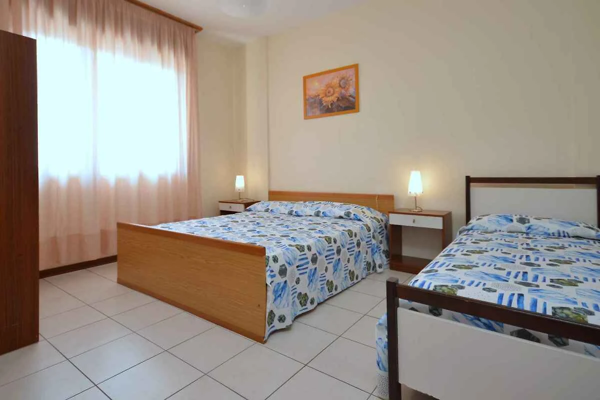 Wohn/Schlafzimmer mit 2 Zusatzbetten auf Couch/Sofa, TV und Zugang zum Balkon. Schlafzimmer mit 1 Doppelbett und 1 Einzelbett. Schlafzimmer mit 1 Einzelbett. Kochecke im Wohn/Schlafzimmer mit Gasherd, Kühlschrank, Mikrowelle und Kaffeemaschine. Bad mit Dusche und WC.