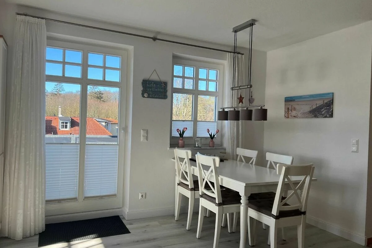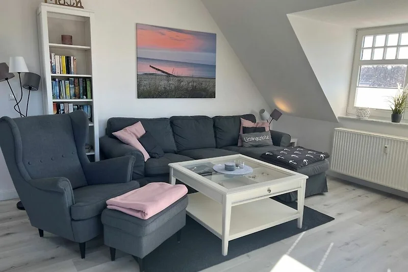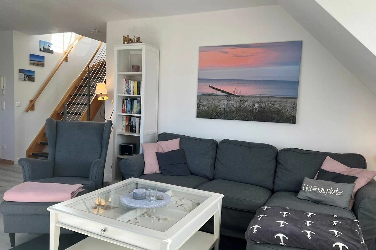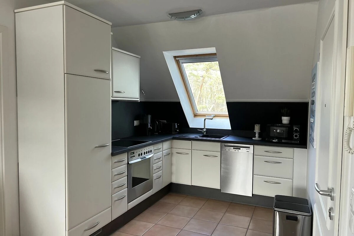 Der gemütliche Wohnbereich verfügt über eine Eckcouch, einen bequemen Sessel und einen Smart-TV. Hier können Sie sich von Ihren Ausflügen in und um Kühlungsborn entspannen. Die Einbauküche ist mit einem Backofen, Geschirrspüler und Mikrowelle ausgestattet und in den Wohnbereich integriert.