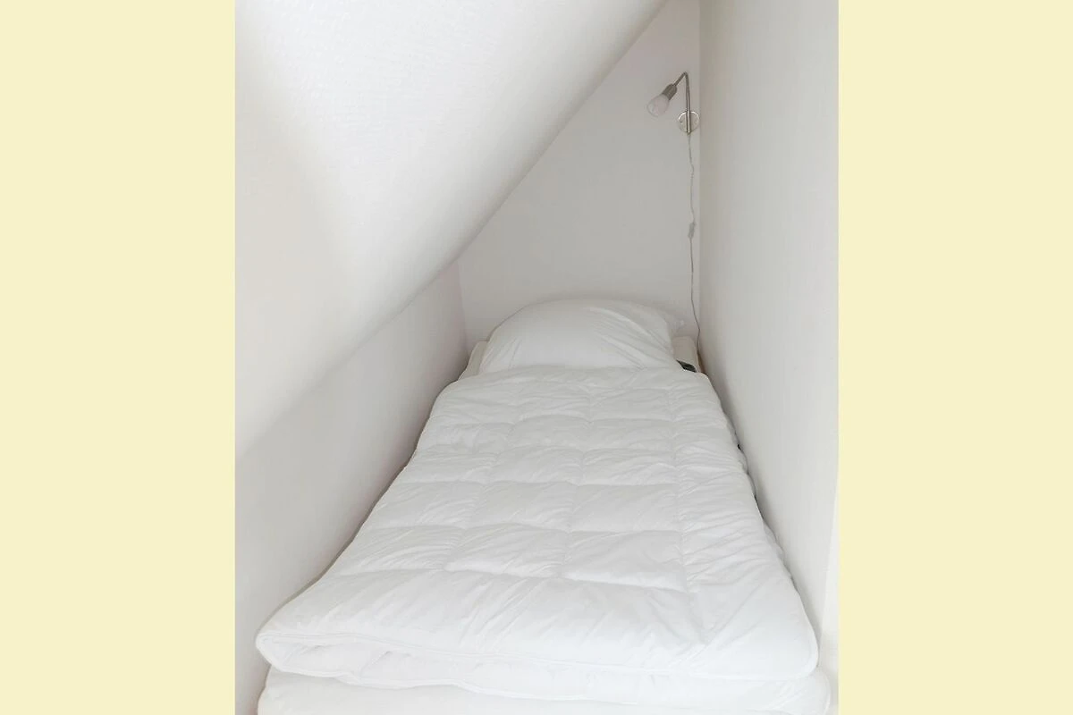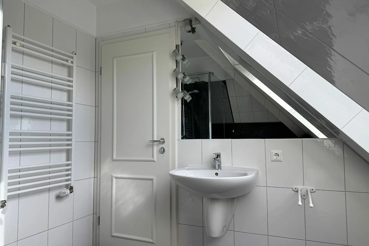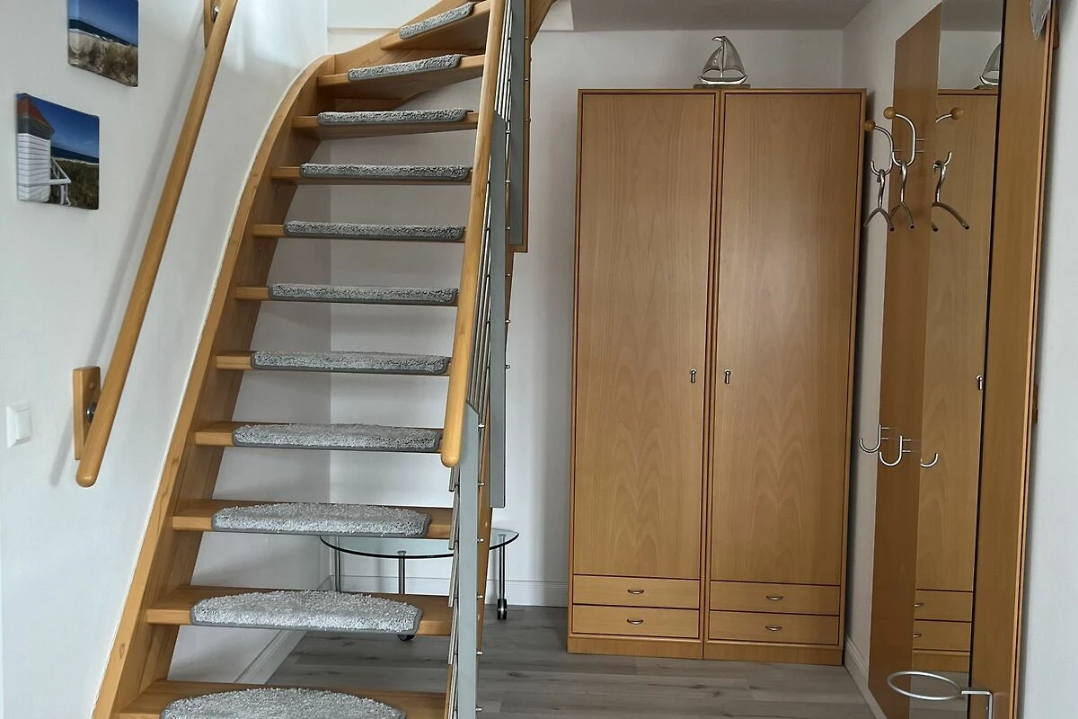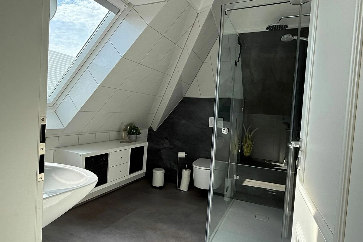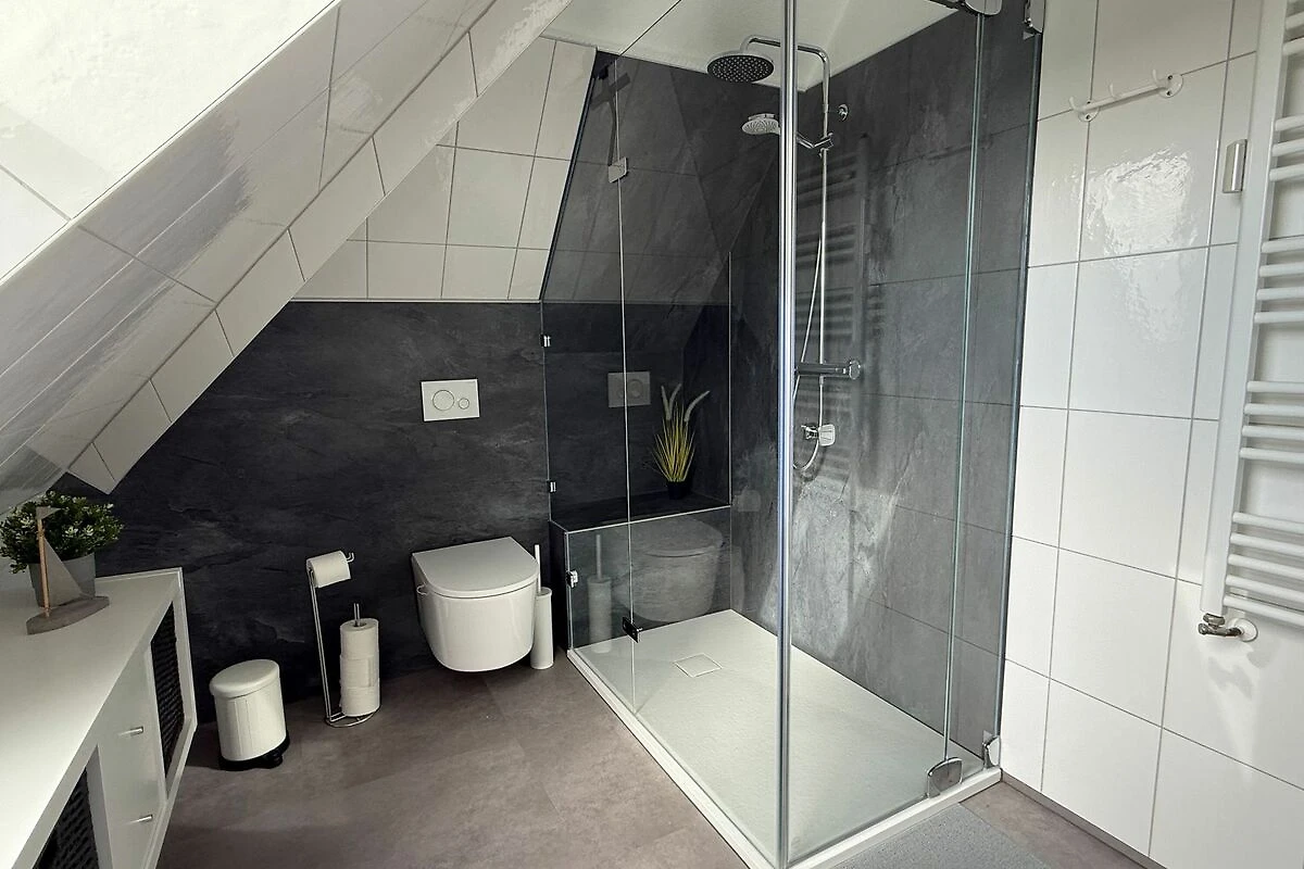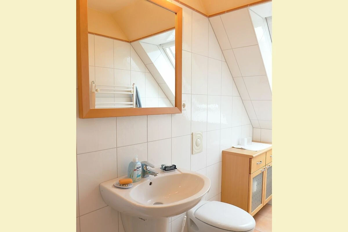 Auf dieser Etage befindet sich auch ein Gäste-WC. Über eine Treppe im Appartement gelangen Sie in das ausgebaute Dachgeschoss, wo sich das frisch renovierte Badezimmer mit Dusche, sowie das Schlafzimmer mit einem Doppelbett (180x200) und TV befinden. In einem Nebenraum stehen Ihnen ein weiteres Doppelbett (140x200) und ein Einzelbett zur Verfügung.