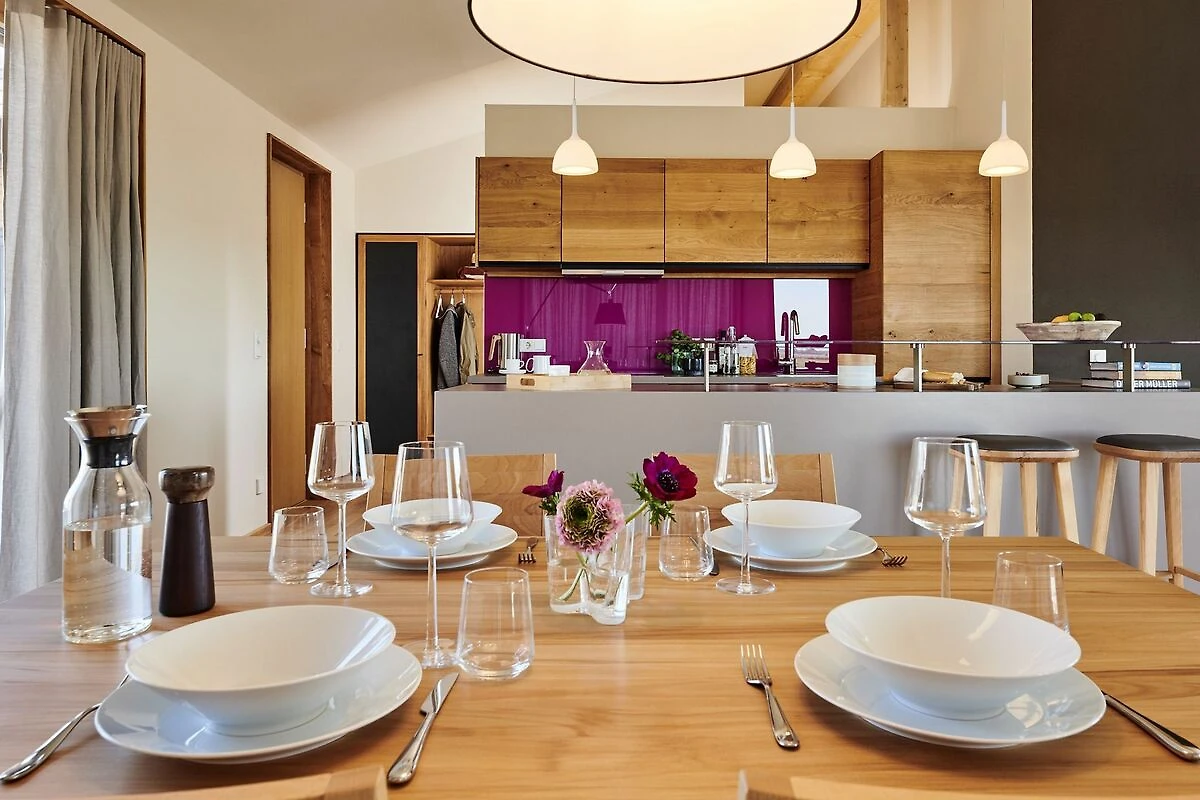 Der grosszügige Wohnraum (40 m²) mit Essbereich, offener Küche und Tresen verfügt über einen 40-TV mit SONOS Soundbar. Die Soundanlage kann über Ihr Smartphone mittels SONOS-App gesteuert werden. Die zwei Schlafzimmer verfügen jeweils über ein Doppelbett (160x200) und einen grossen Einbauschrank. Bei Bedarf kann ein Zustellbett (80x200, gegen Gebühr) ergänzt werden. Ein Schlafraum ist mit einem 32-TV ausgestattet. Alle Küchengeräte wie Induktionsherd, Spülmaschine und Kühlschrank mit 4-Sterne-Gefrierfach sowie Waschmaschine und Trockner stammen aus dem Hause Miele. Dank eines hochmodernen Glasfaseranschlusses (250 MBit) ist eine leistungsstarke Internetverbindung vorhanden (z.B. für Streaming). Das WLAN im Haus kann auf Wunsch deaktiviert werden.