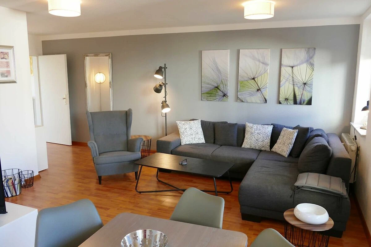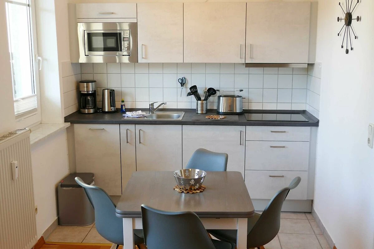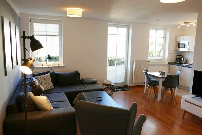 Hell, modern und freundlich - diese charmante 46 qm grosse Ferienwohnung im Erdgeschoss ist ein schönes Zuhause auf Zeit für bis zu 4 Personen. Der Wohnbereich und das Schlafzimmer sind mit Laminatfussboden versehen. Im offenen Wohnbereich finden Sie alles, was das Urlaubsleben angenehm macht - angefangen von der bequemen Couch, Lesesessel, Flachbild-TV, Esstisch mit 4 Stühlen bis hin zur offenen Küchenzeile mit Ceranherd, Kühlschrank, Mikrowelle, Wasserkocher, Toaster und Kaffeemaschine. Hier finden Sie alles, was nötig ist für entspannte Frühstücke oder um einen erlebnisreichen Urlaubstag ausklingen zu lassen. Das Schlafzimmer ist mit einem gemütlichen Doppelbett ausgestattet, das für erholsame Nächte sorgt. Das Badezimmer bietet Ihnen eine Dusche, WC und ausreichend Ablagefläche, um Ihren Aufenthalt so angenehm wie möglich zu gestalten. Die möblierte Terrasse ist vom Wohnzimmer aus begehbar und lädt dazu ein bei schönem Wetter bereits morgens mit einer Tasse Kaffee in den Tag zu starten. Natürlich ist kostenfreies WLAN inklusive. Ihren Pkw können Sie in der Tiefgarage parken und Ihre eigenen Räder ganz praktisch im Fahrradkeller unterstellen. Im Keller befinden sich zudem Waschmaschinen und Trockner, die gegen eine Gebühr nutzbar sind.