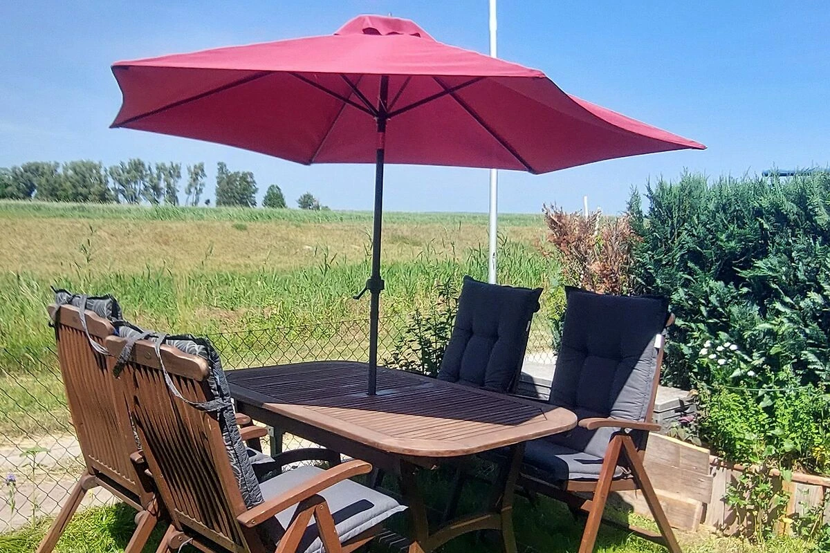 Man betritt das Haus über eine Terrasse mit einer hübsche Bank, hinter dem Haus ist zu Deich eine grosse Terrasse mit einem 3sitzer Strandkorb von dem aus man die Segel über das Haff gleiten sieht.