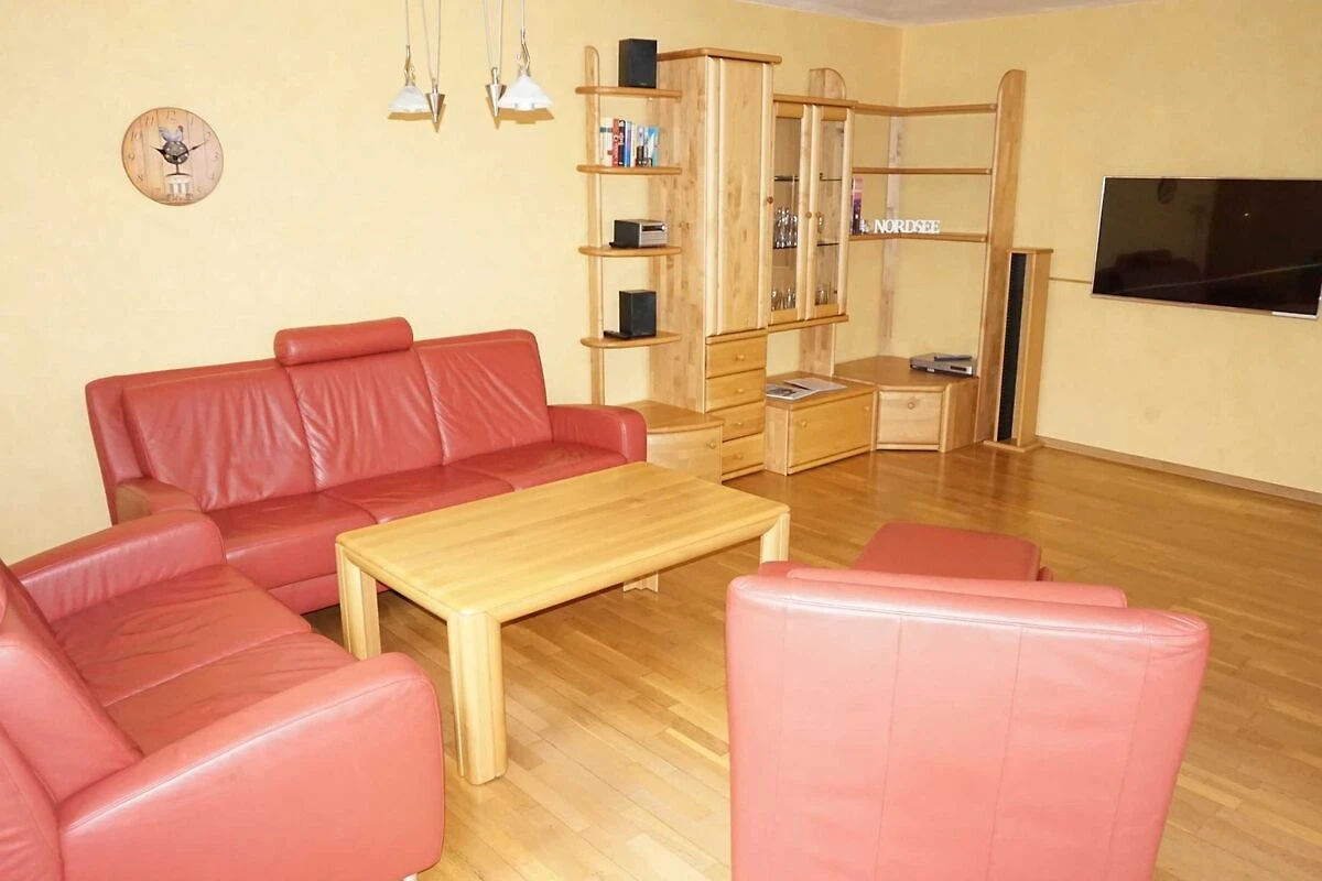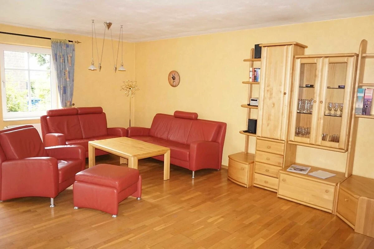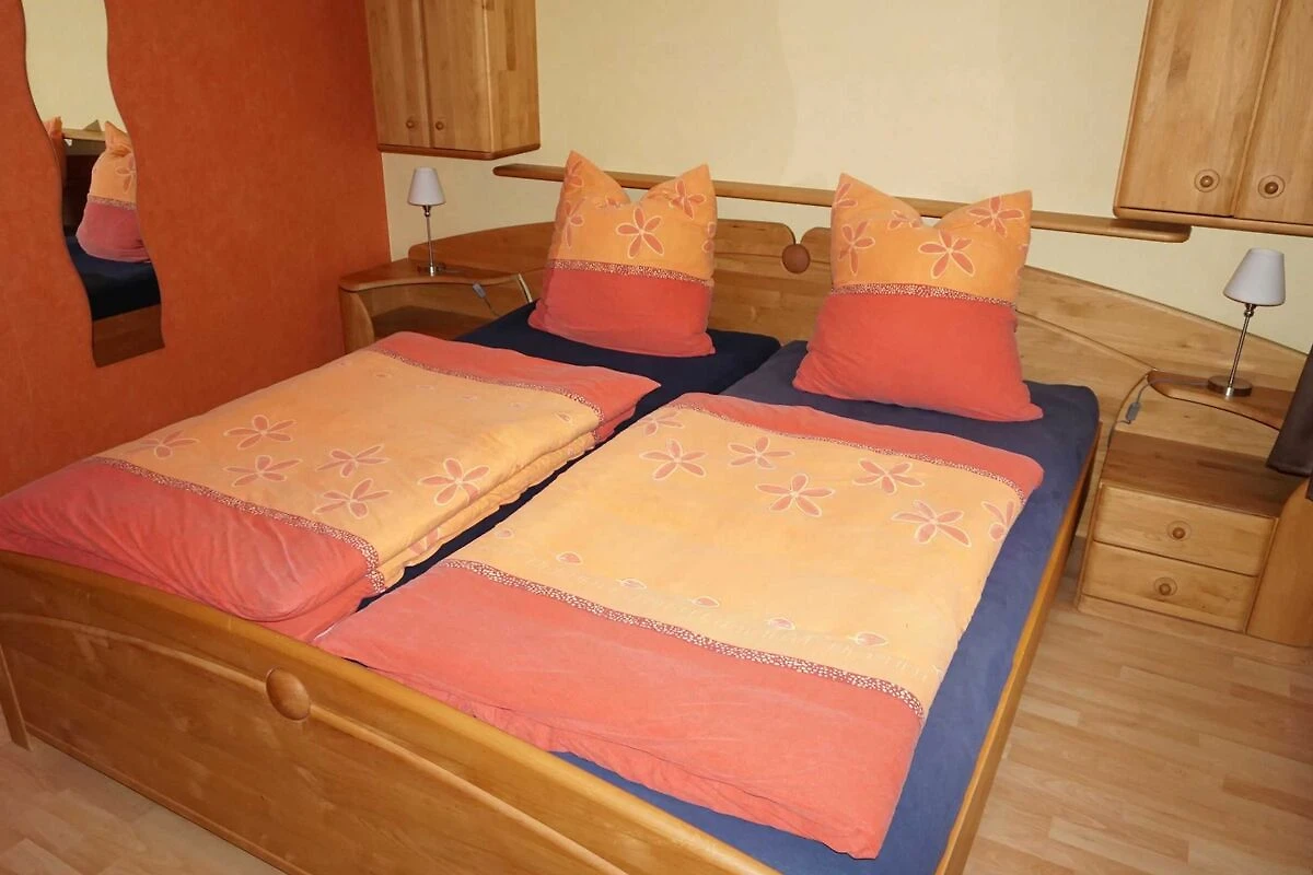 Komfort Ferienwohnung im Ergeschoss für 6 Personen und 1 Kleinkind. Grosszügige und komplett ausgestattete Küche mit Essplatz. 2 Schlafzimmer mit Doppelbett (davon 1 Schlafzimmer mit TV und erhöhten Betten), 1 Schlafzimmer mit Etagenbett. Wohnzimmer mit massiven Möbeln, Ledercouchgarnitur und grossem Sat-TV. Badezimmer mit Badewanne und Dusche/WC. Separates Gäste-WC. Die Garage wird als Abstellraum für Waschmaschine und Trockner (gegen Gebühr) sowie kann als Unterstellmöglichkeit für Fahrräder genutzt werden. Hier finder Sie auch eine gemeinschaftliche Gefrirrbox vor.
