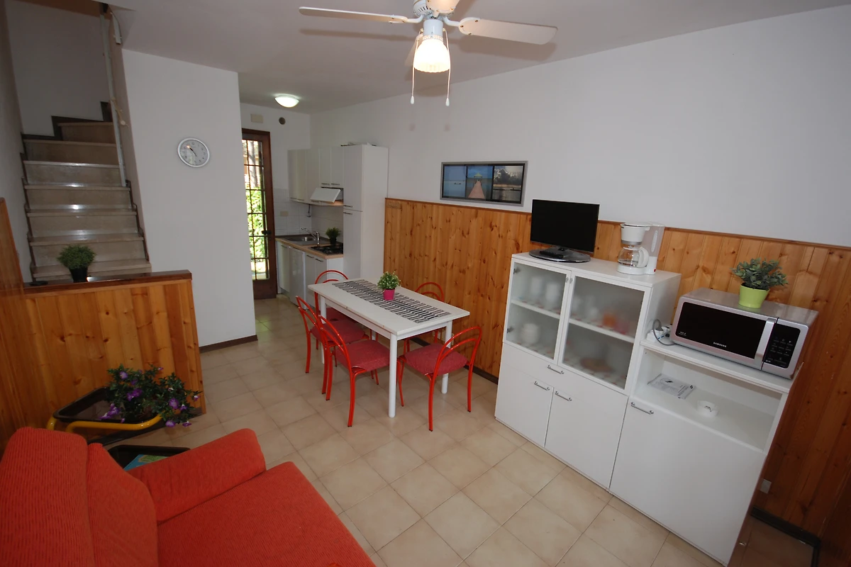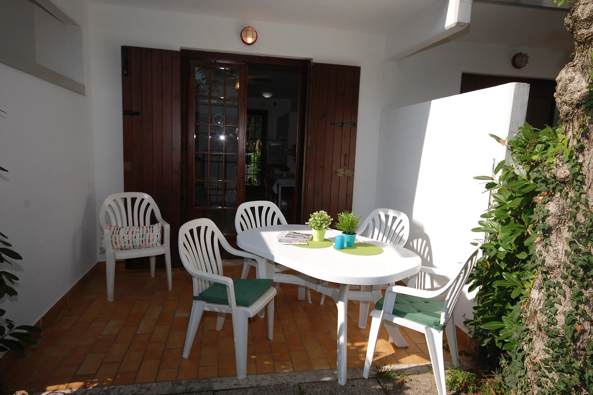 Lignano, Ortsteil Pineta. Die Ferienwohnung befindet sich in einer Ferienanlage, auf einem Gartengrundstück. Neue, voneinander unabhängige, zweistöckige Reihenhäuser. Parkplatz (für 1 Pkw) auf dem Grundstück.