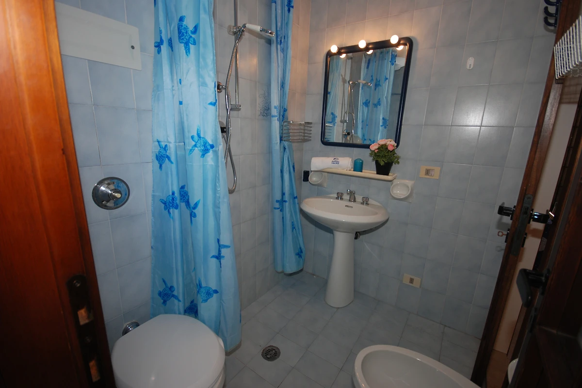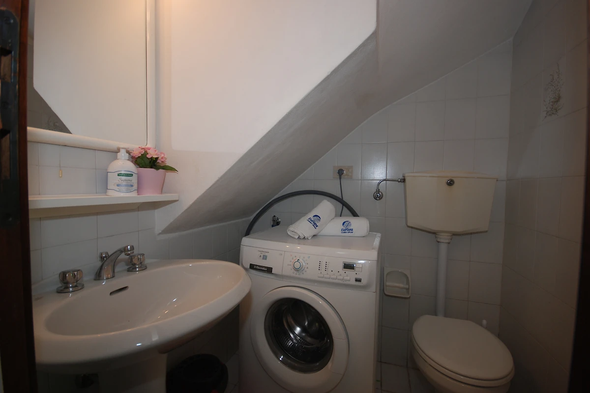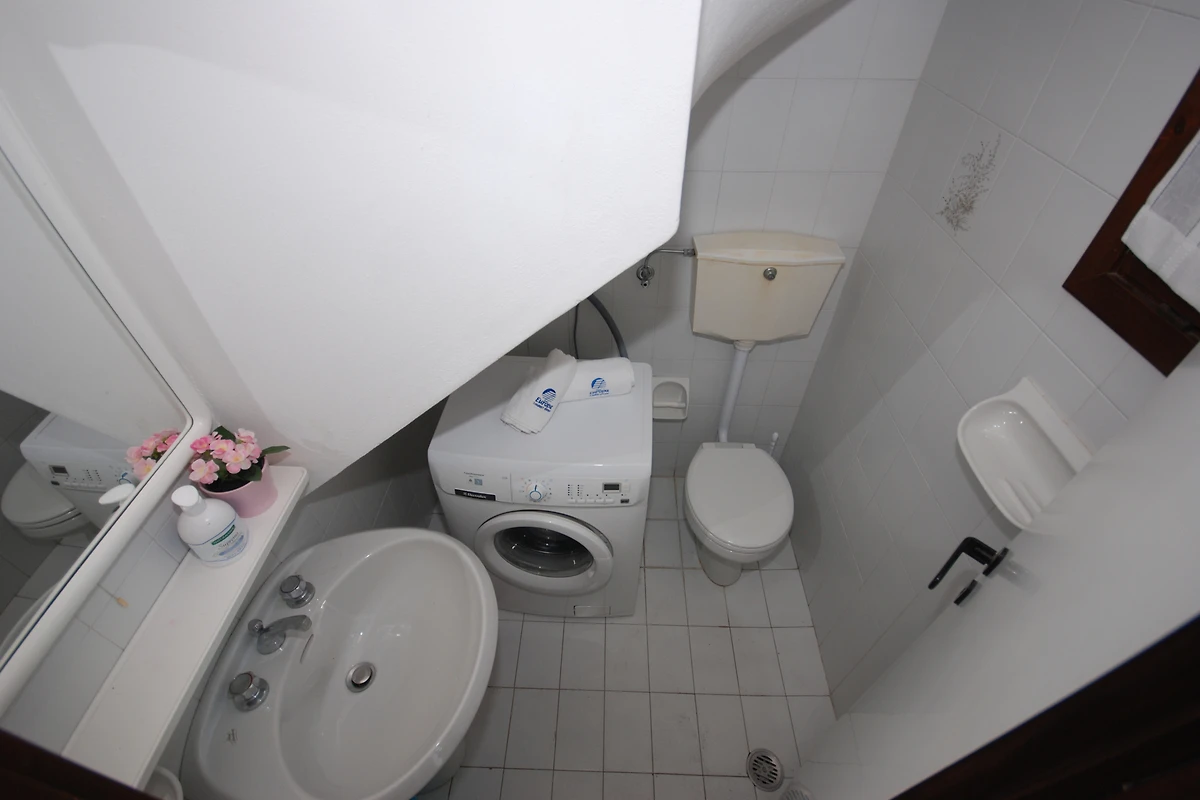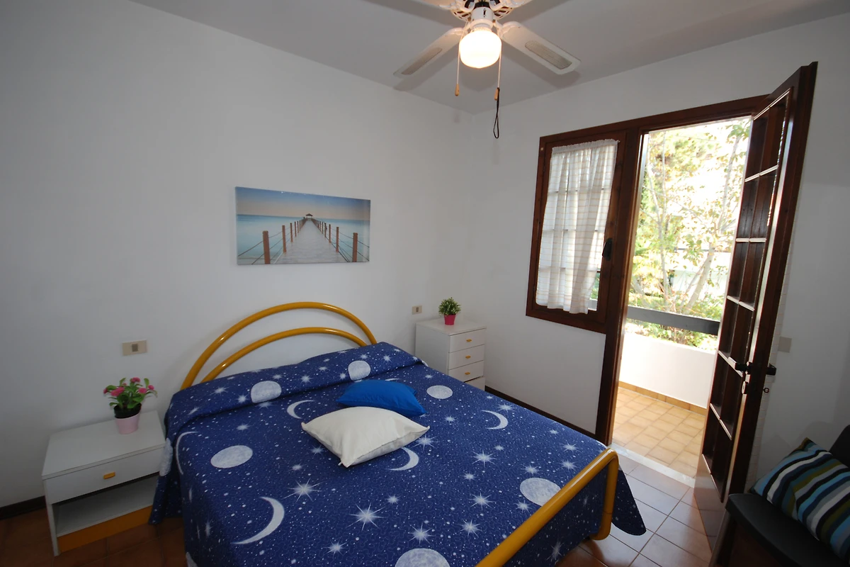 1. Etage: Schlafzimmer mit 1 Doppelbett, 1 Gitterbett, Zugang zum Balkon und Babybett auf Wunsch. Bad mit Dusche und WC.