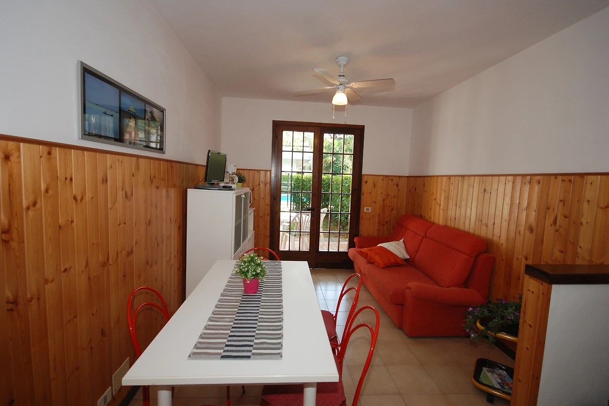 Erdgeschoss: Wohn/Schlafzimmer mit 1 Zusatzbett auf Couch/Sofa, TV und Zugang zur Terrasse. Kochnische im Wohn/Schlafzimmer mit Gasherd, Kühlschrank, Mikrowelle und Kaffeemaschine.