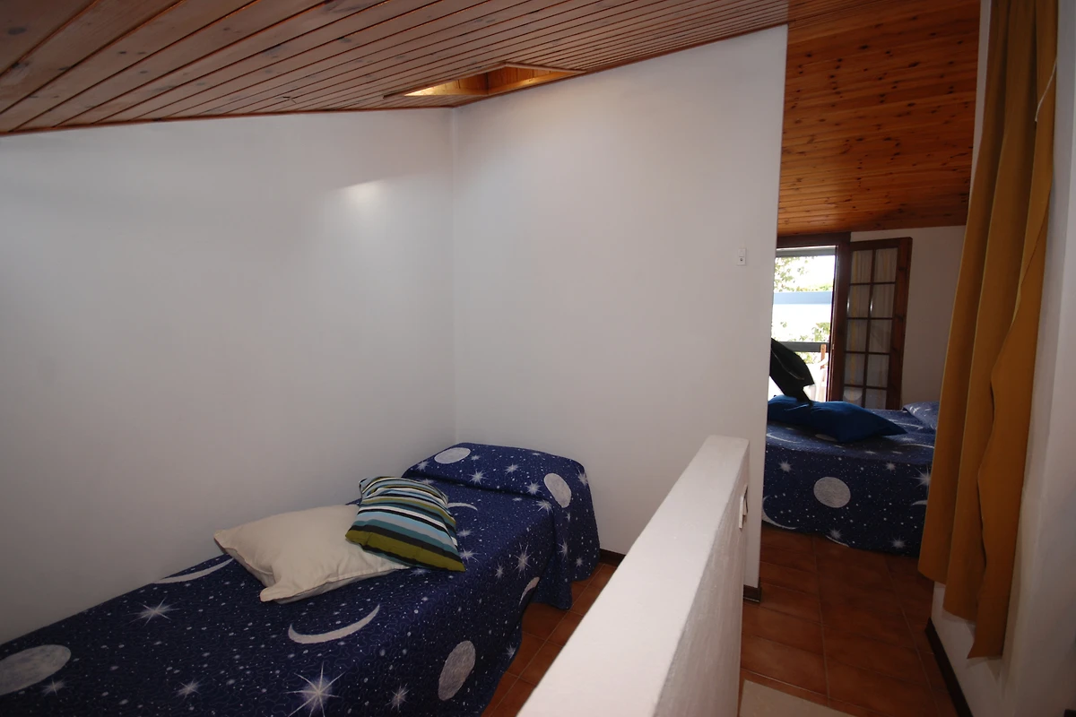 Dachgeschoss: Schlafzimmer mit 3 Einzelbetten und Zugang zum Balkon.