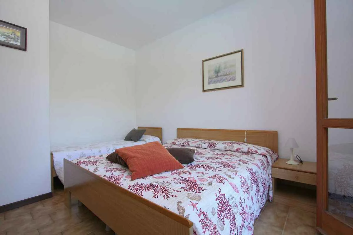 1. Etage: Schlafzimmer mit 1 Doppelbett, 1 Einzelbett und Zugang zum Balkon. Bad mit Dusche und WC.