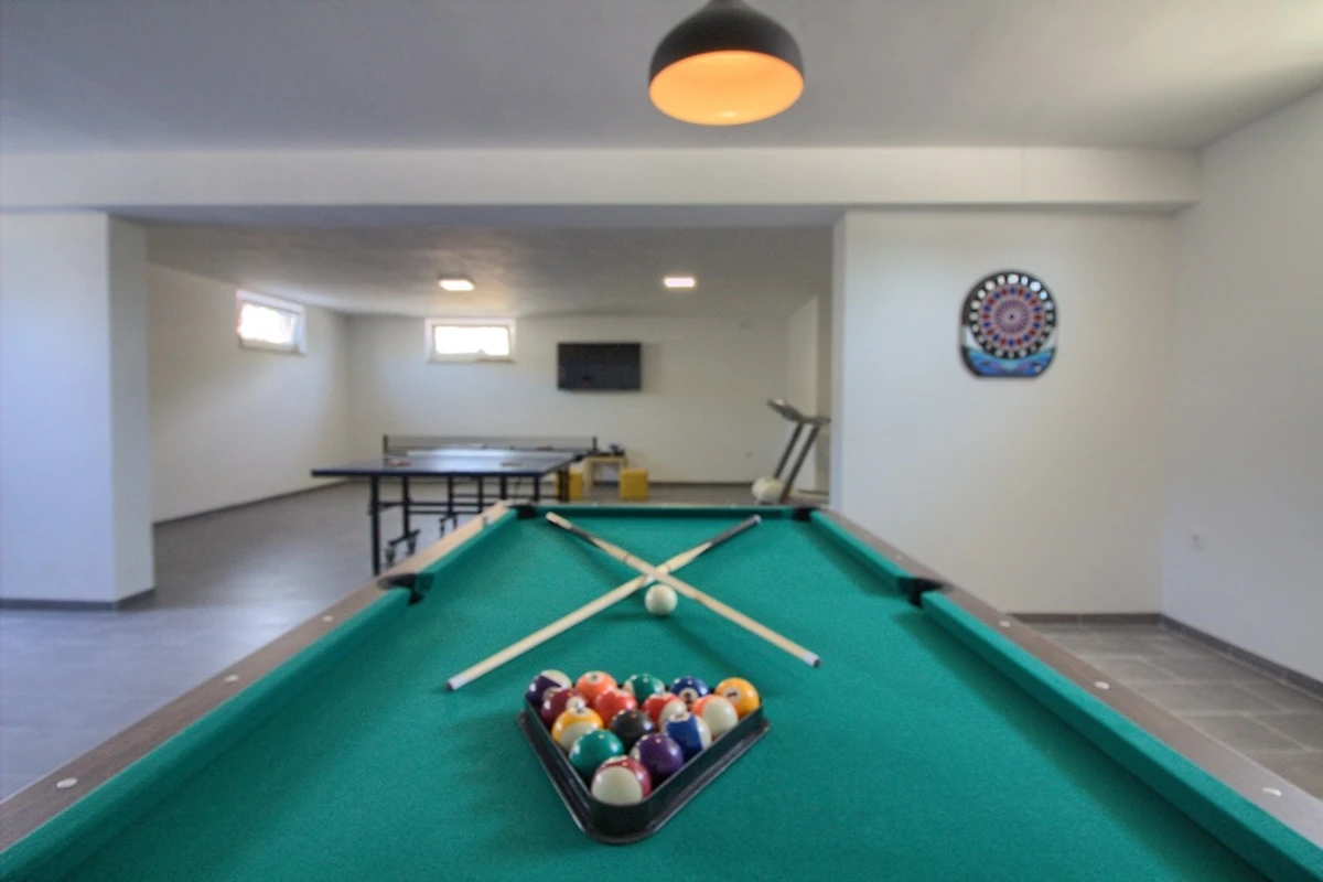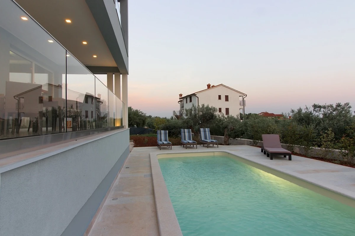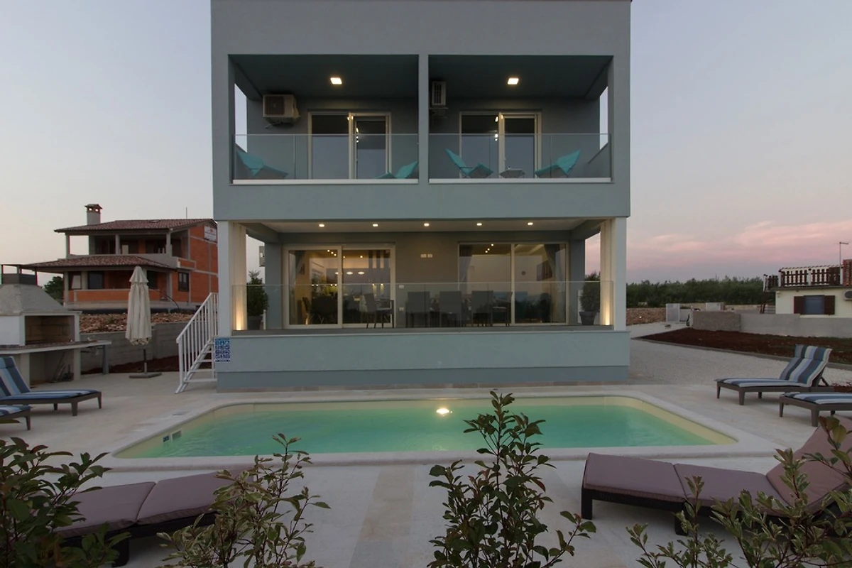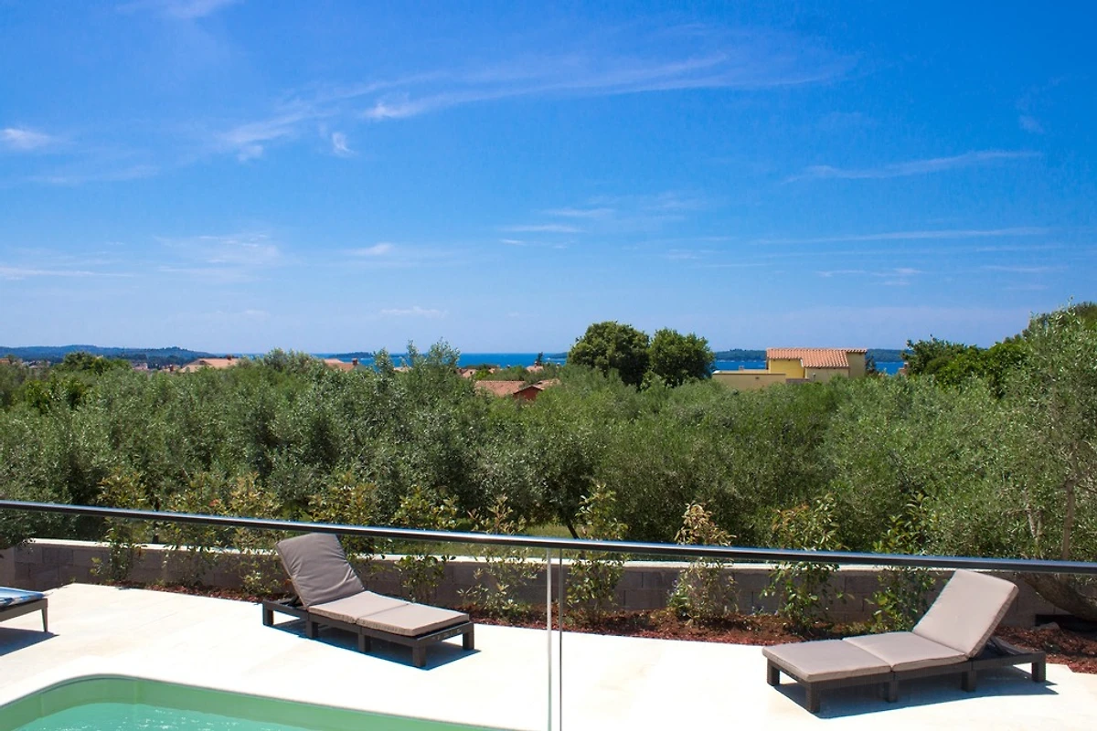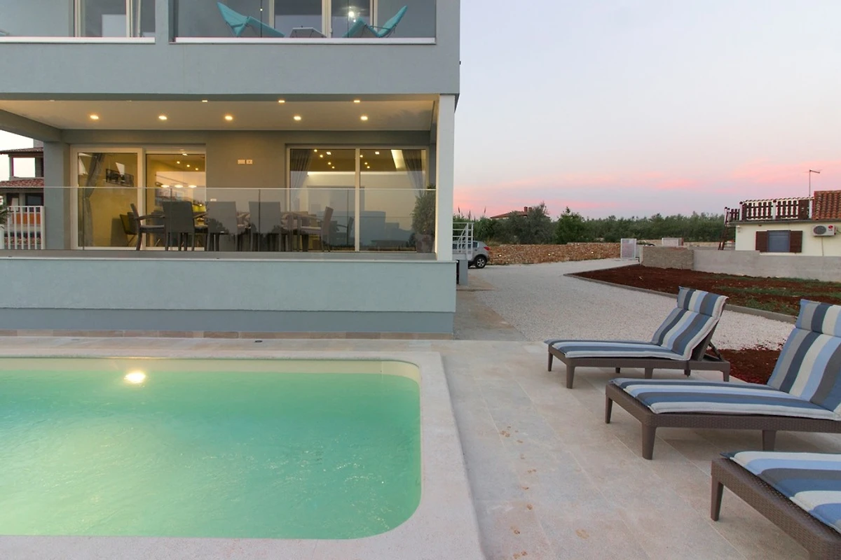 Dies ist eine wunderschöne Designer-Villa in Fazana, nur einen kurzen Spaziergang vom nächsten Strand entfernt. Die Villa Horizont wird all Ihre Wünsche bezüglich eines außergewöhnlichen Urlaubserholungsortes erfüllen! Die Villa befindet sich in einer ruhigen Gegend und wurde im Juli 2019 fertiggestellt. Um das Zentrum von Fazana, Geschäfte, Restaurants usw. zu erreichen, müssen Sie nicht das Auto benutzen, alles ist nur einen kurzen Spaziergang entfernt. Zu Ihrer Verfügung in der Villa haben Sie einen schönen Pool mit Meerblick, einen großen Garten mit Olivenbäumen und viel Platz zum Sonnenbaden. Für die Kleinsten gibt es auch ein Spielzimmer mit Billard, Fitnessraum, Dart, Tischfußball, Tischtennis und Playstation 4. Der Außenbereich, in dem Sie wahrscheinlich die meiste Zeit verbringen werden, hat auch einen Holzkohlegrill und einen überdachten Essbereich mit Meerblick . Dort können sich alle versammeln und Mahlzeiten im Freien genießen. Die Balkone in der oberen Etage bieten einen schönen Blick auf das Meer und die Brijuni-Inseln und sind der perfekte Ort für einen abendlichen Drink. Der Innenraum ist geschmackvoll in einem modernen und sauberen Stil eingerichtet und in zwei Etagen unterteilt. Das Erdgeschoss besteht aus einem geräumigen Wohnzimmer, einer voll ausgestatteten Küche mit Essbereich und einem Schlafzimmer mit Bad. Die restlichen drei Schlafzimmer verteilen sich auf die obere Etage und verfügen jeweils über ein Doppelbett, ein eigenes Bad, einen Balkon mit Meerblick, einen Flachbild-TV und eine Klimaanlage. Das Grundstück ist komplett eingezäunt, bietet einen großen privaten Parkplatz