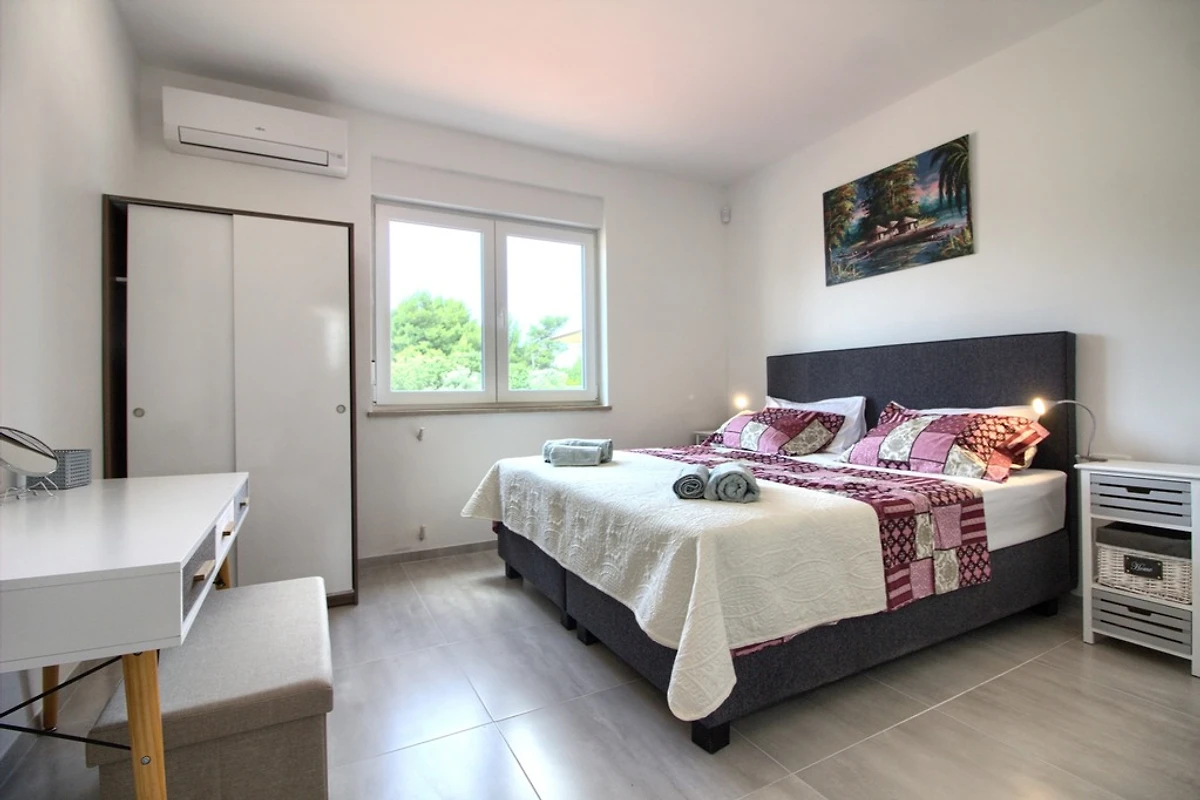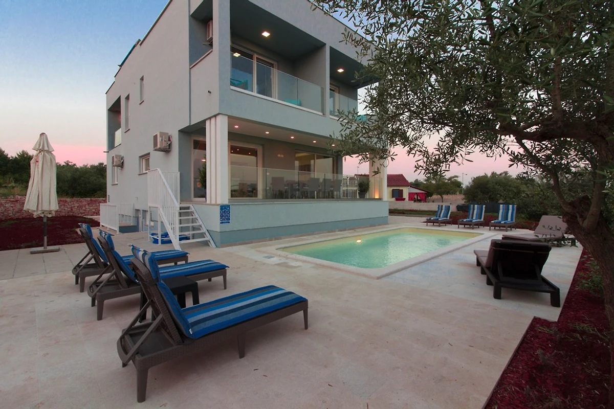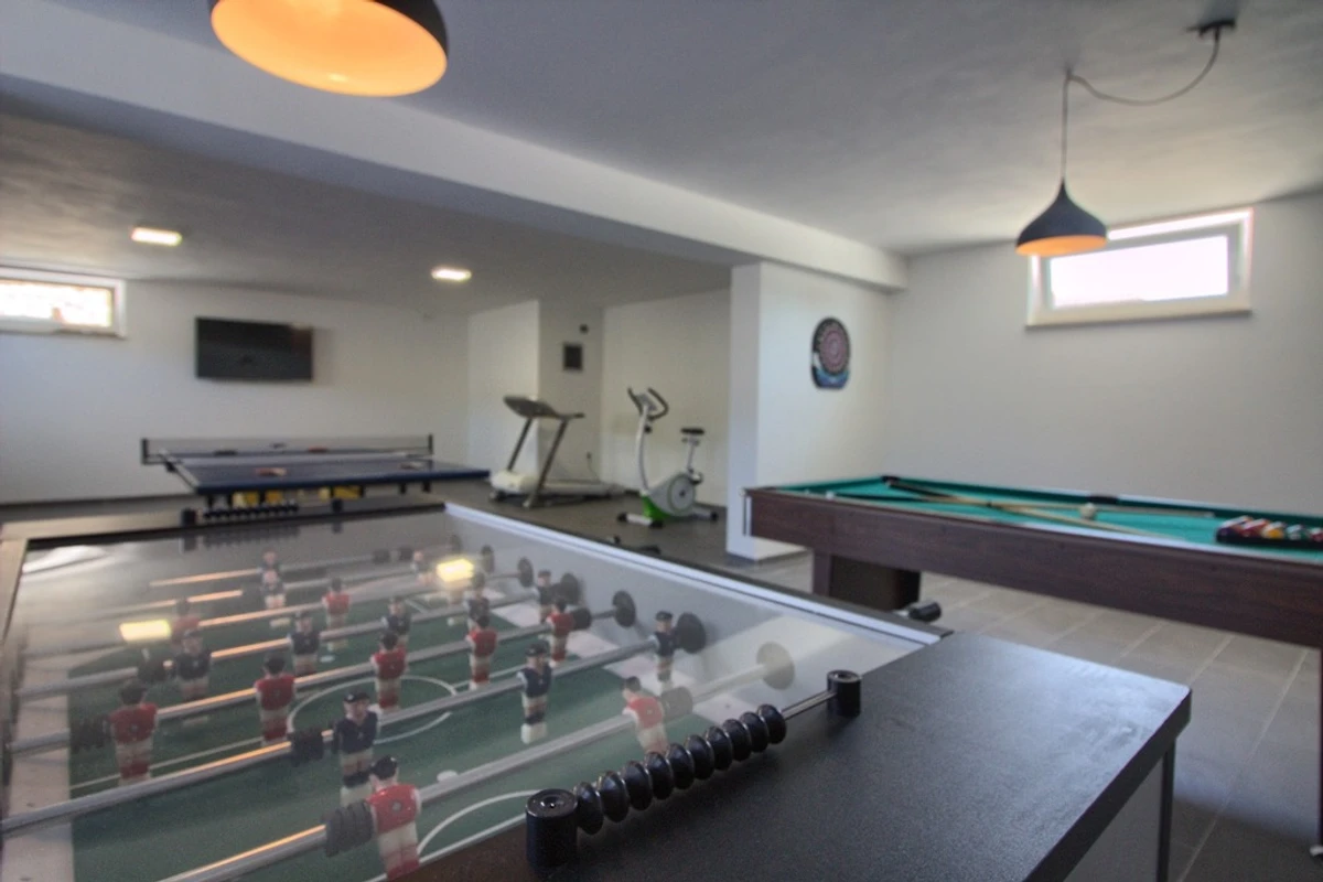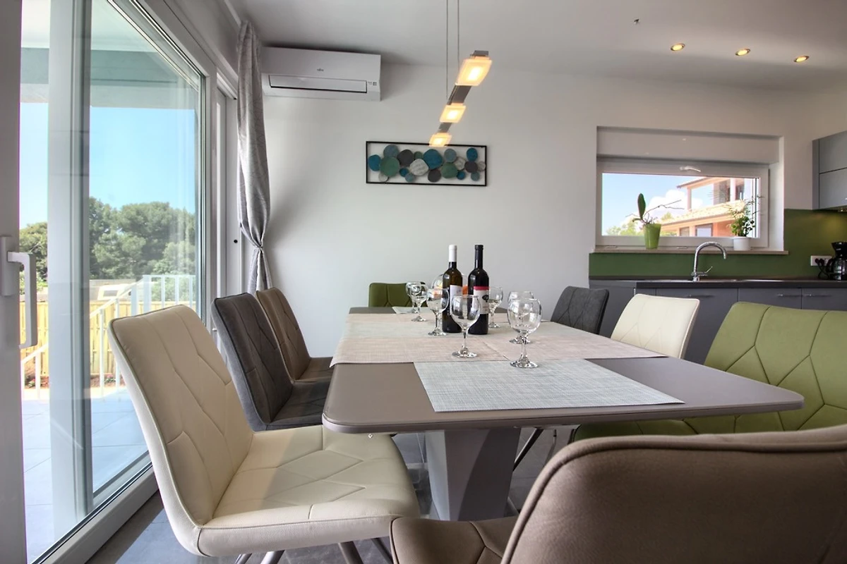 Dies ist eine wunderschöne Designer-Villa in Fazana, nur einen kurzen Spaziergang vom nächsten Strand entfernt. Die Villa Horizont wird all Ihre Wünsche bezüglich eines außergewöhnlichen Urlaubserholungsortes erfüllen! Die Villa befindet sich in einer ruhigen Gegend und wurde im Juli 2019 fertiggestellt. Um das Zentrum von Fazana, Geschäfte, Restaurants usw. zu erreichen, müssen Sie nicht das Auto benutzen, alles ist nur einen kurzen Spaziergang entfernt. Zu Ihrer Verfügung in der Villa haben Sie einen schönen Pool mit Meerblick, einen großen Garten mit Olivenbäumen und viel Platz zum Sonnenbaden. Für die Kleinsten gibt es auch ein Spielzimmer mit Billard, Fitnessraum, Dart, Tischfußball, Tischtennis und Playstation 4. Der Außenbereich, in dem Sie wahrscheinlich die meiste Zeit verbringen werden, hat auch einen Holzkohlegrill und einen überdachten Essbereich mit Meerblick . Dort können sich alle versammeln und Mahlzeiten im Freien genießen. Die Balkone in der oberen Etage bieten einen schönen Blick auf das Meer und die Brijuni-Inseln und sind der perfekte Ort für einen abendlichen Drink. Der Innenraum ist geschmackvoll in einem modernen und sauberen Stil eingerichtet und in zwei Etagen unterteilt. Das Erdgeschoss besteht aus einem geräumigen Wohnzimmer, einer voll ausgestatteten Küche mit Essbereich und einem Schlafzimmer mit Bad. Die restlichen drei Schlafzimmer verteilen sich auf die obere Etage und verfügen jeweils über ein Doppelbett, ein eigenes Bad, einen Balkon mit Meerblick, einen Flachbild-TV und eine Klimaanlage. Das Grundstück ist komplett eingezäunt, bietet einen großen privaten Parkplatz