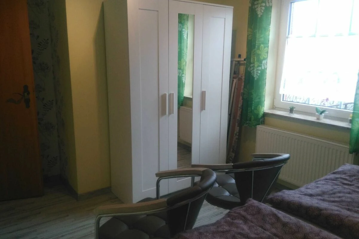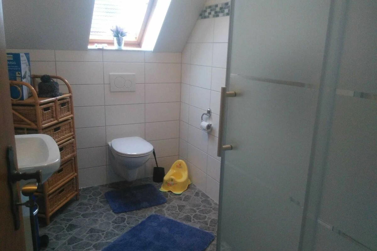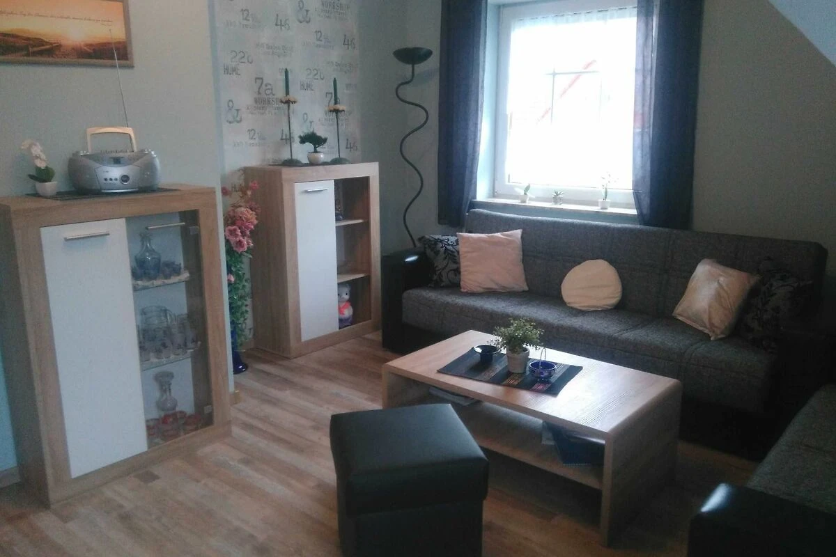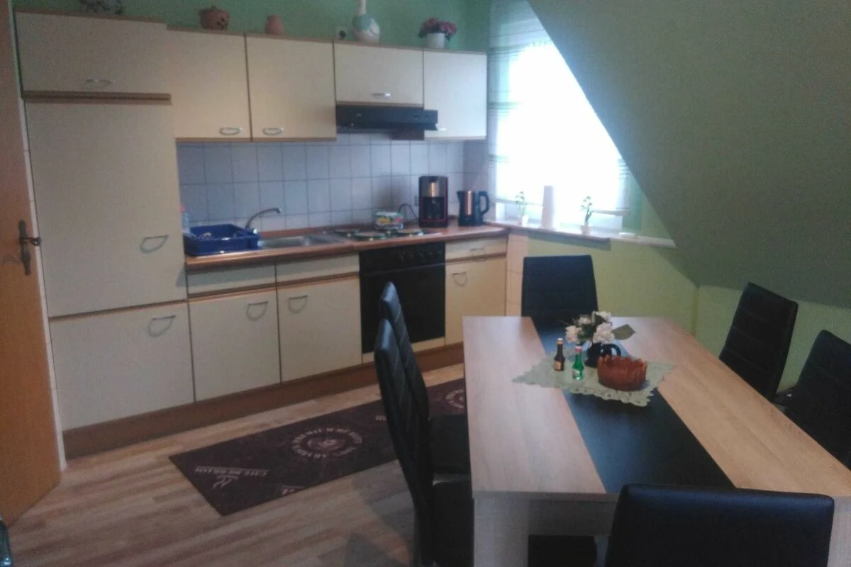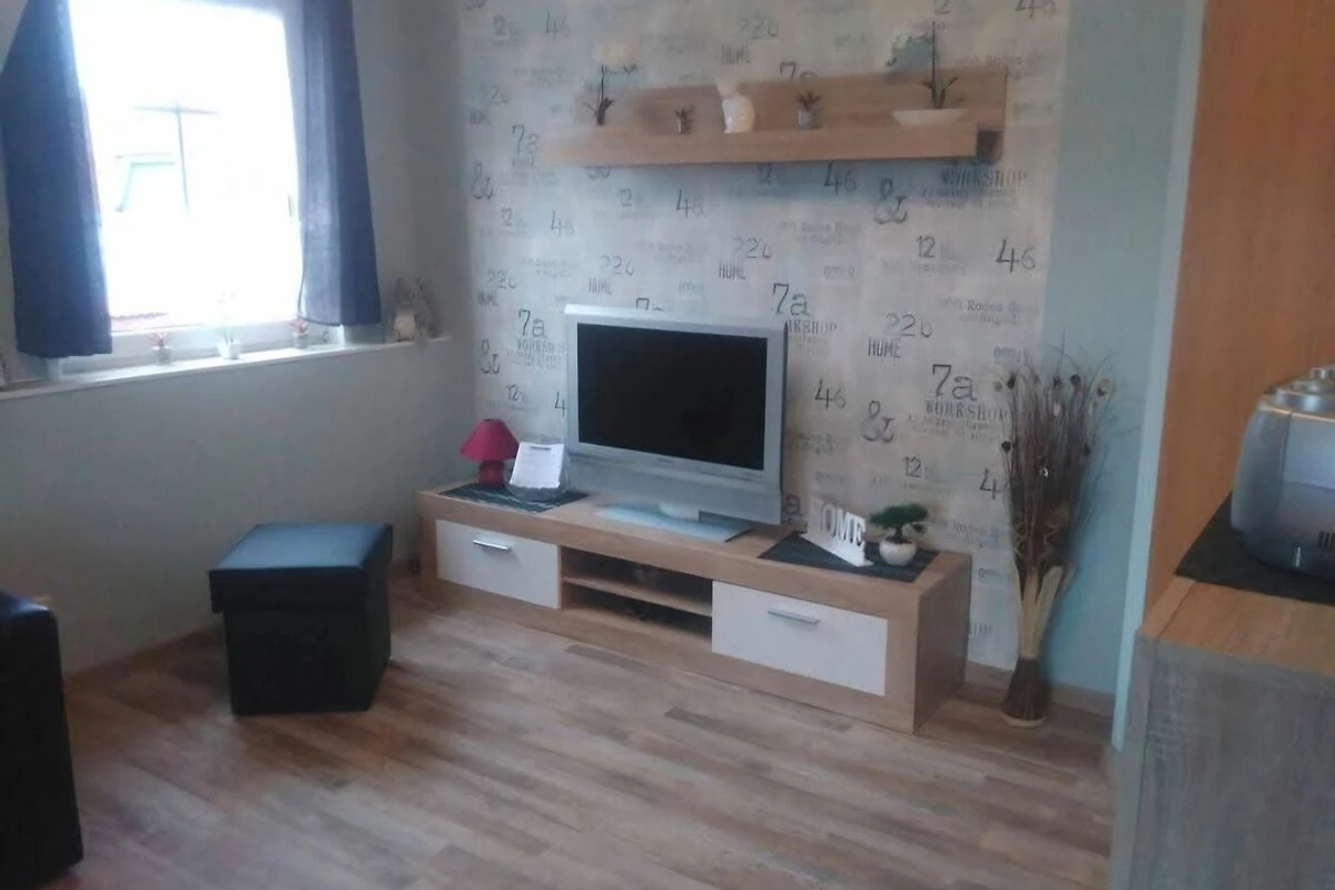 Küche: komplett eingerichtete Einbauküche mit E.-Herd + Backofen, Kühlschrank, Toaster, Eierkocher, Kaffeemaschine, Bügeleisen, Bügelbrett,Tisch + 6 Stühlen, Kinderhochstuhl. Wohnzimmer: gemütliche 2er und 3er Couch, Sat-TV, Anbauschrankwand. Schlafzimmer 1: Doppelbett, Nachtschränke, Kleiderschrank; Schlafzimmer 2. Doppelbett, Nachtschränke, Kleiderschrank, Kindergitterbett oder Reisebett kann bei Bedarf aufgebaut werden. Das Bad mit Dusche, Waschtisch, WC und Kindertöpfchen liegt direkt neben dem Elternschlafzimmer. Nichtraucherwohnung.Unten im Garten eine eigene Terrasse.