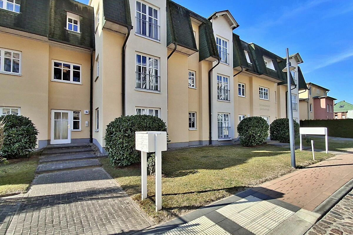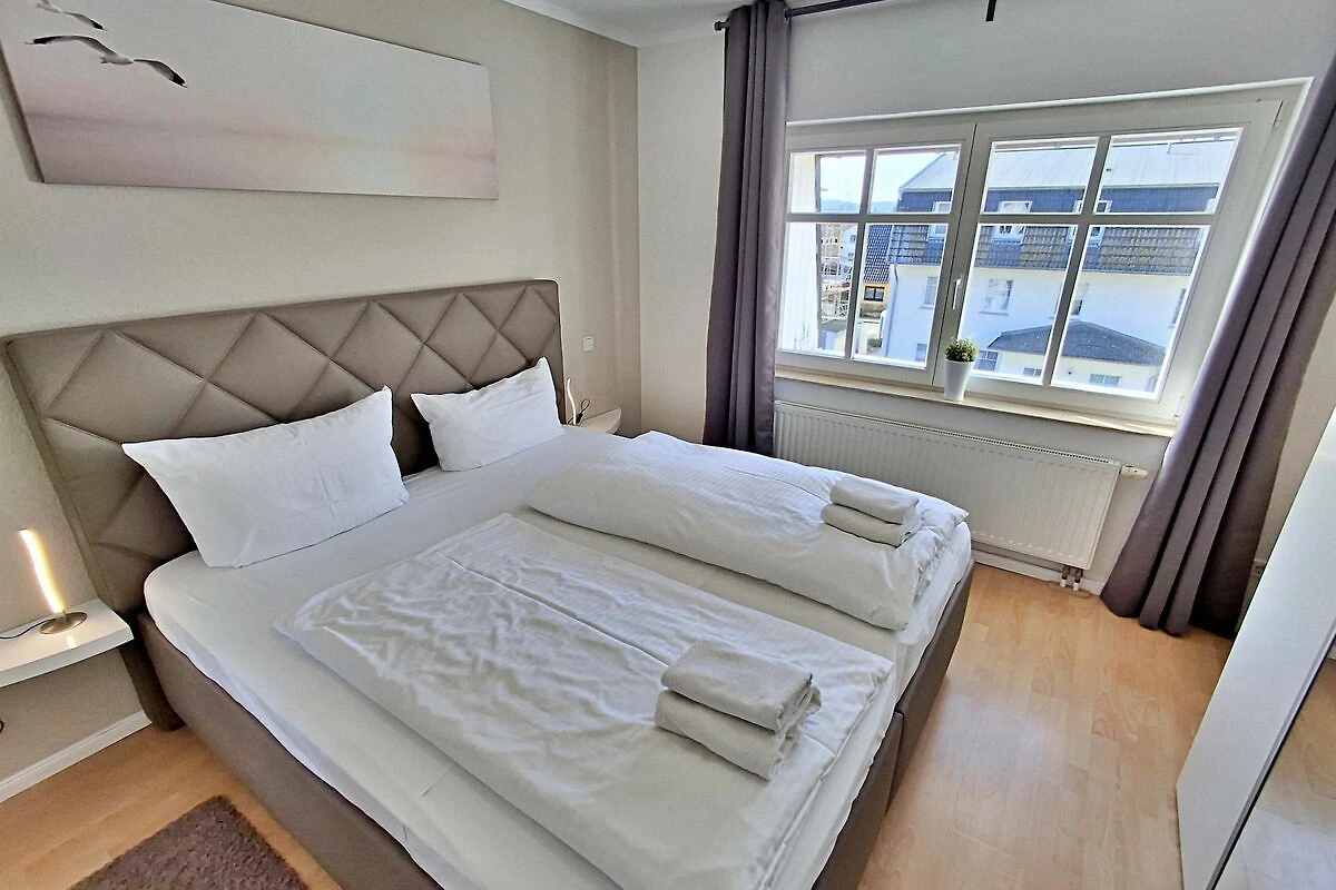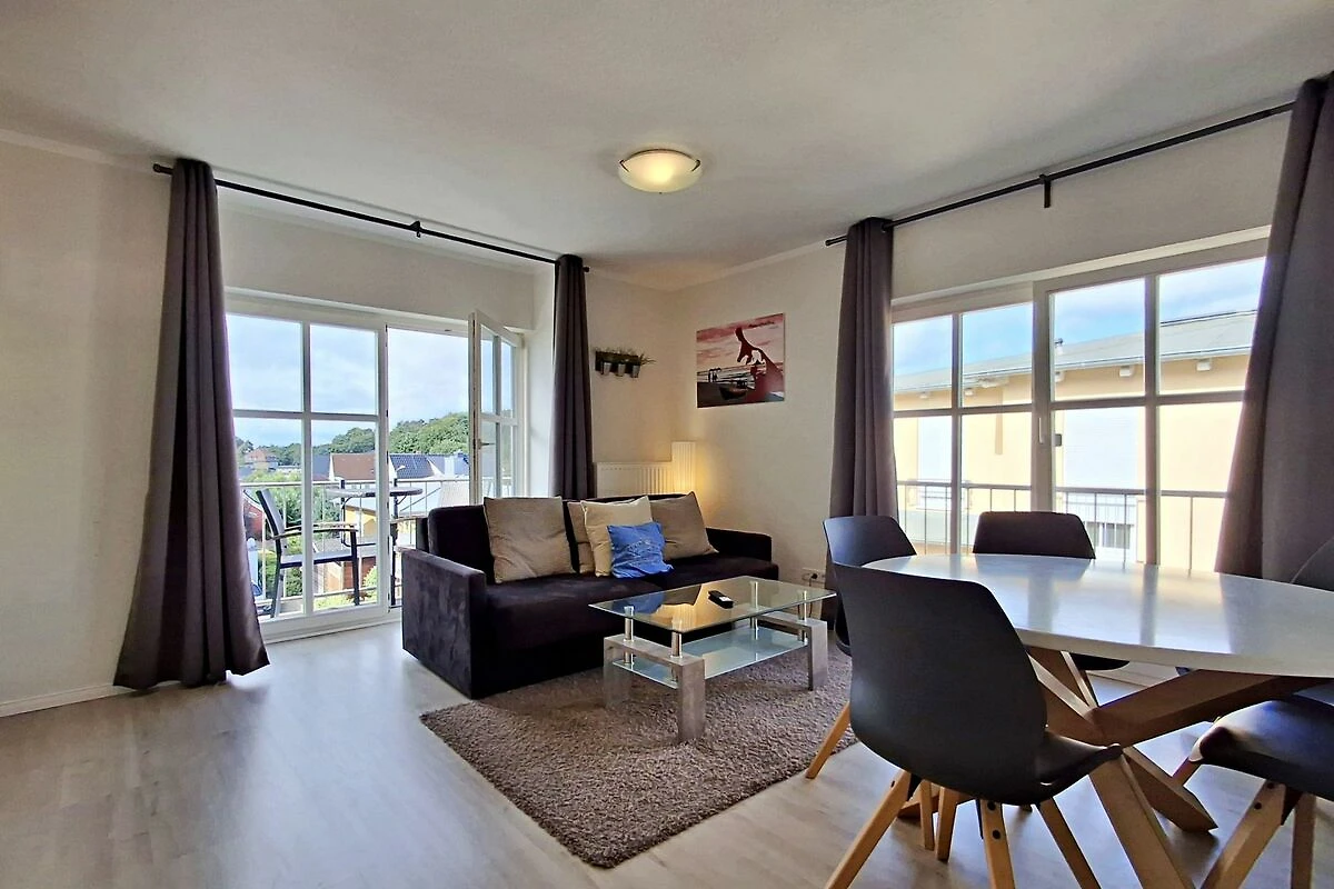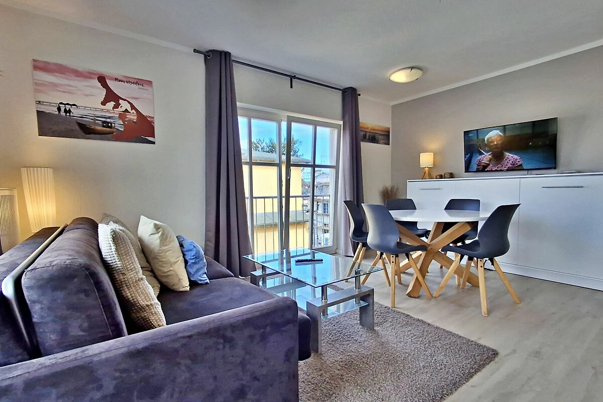 Herzlich willkommen in der hellen und freundlichen Ferienwohnung in der zweiten Etage des Feriendomizils Goethestrasse! Auf 48 qm bietet diese schöne Wohnung Platz für bis zu 4 Personen, damit Sie einen erholsamen und entspannten Urlaub geniessen können. Die stilvoll eingerichtete Wohnung verfügt über ein einladendes Wohn- und Esszimmer, das mit einer bequemen Couch ausgestattet ist, die auch Platz für 2 weitere Personen bietet. Hier finden Sie auch einen Flachbild-TV und einen Esstisch mit 4 Stühlen. In der vollwertigen Küche stehen Ihnen ein 4-Platten-Herd, Backofen, Spülmaschine, Wasserkocher und Kaffeemaschine zur Verfügung - alles, was Sie für die Zubereitung Ihrer Lieblingsgerichte benötigen! Das separate Schlafzimmer ist mit einem gemütlichen Doppelbett, einem grosszügigen Kleiderschrank und einem zusätzlichen Flachbild-TV ausgestattet, sodass Sie sich auch hier wohlfühlen können. Das Tageslicht-Bad bietet Ihnen eine Dusche und WC für Ihren Komfort. Geniessen Sie die frische Ostseeluft auf unserem kleinen Balkon, der mit zwei Sitzmöglichkeiten ausgestattet ist - perfekt, um sich zu jeder Tageszeit zu entspannen. Zudem stehen Ihnen W-LAN und ein Parkplatz direkt hinter dem Haus kostenfrei zur Verfügung.