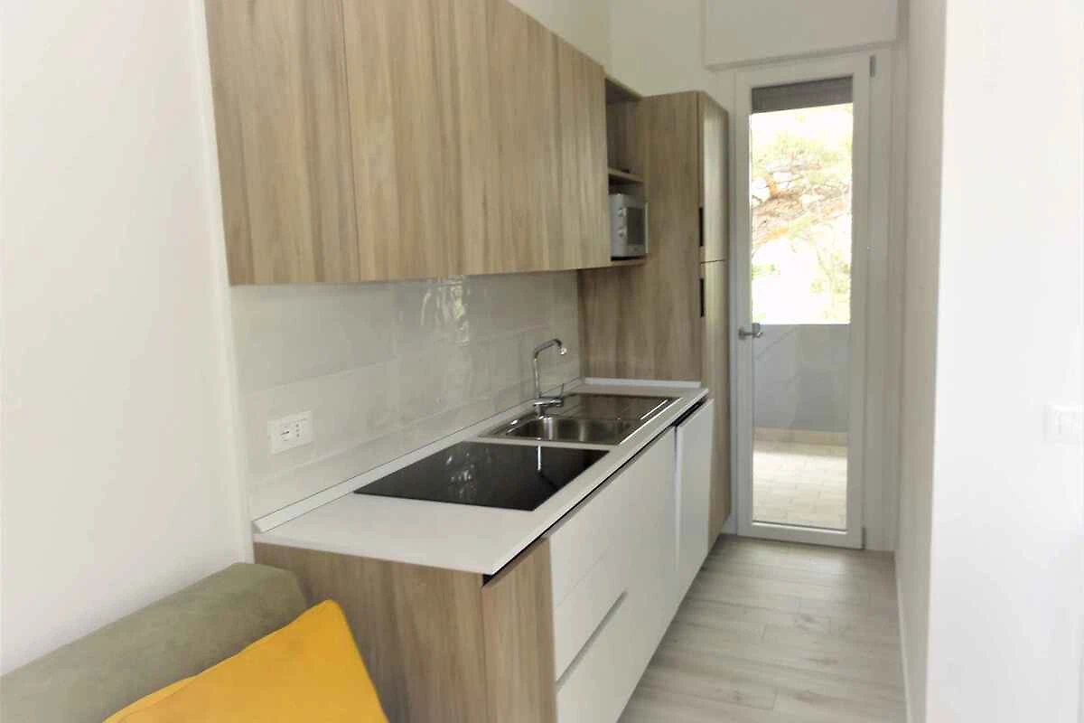 und führt über eine Aussentreppe und den Balkon direkt in das Wohnzimmer. Wohnzimmer mit 1 Zusatzbett auf Couch/Sofa, TV und Essecke (7 Plätze). Schlafzimmer mit 1 Doppelbett. Schlafzimmer mit 2 Einzelbetten. Schlafzimmer mit 1 Etagenbett. Kochecke im Wohnzimmer mit Elektroherd (Induktionsherd, 4 Platten), Geschirrspüler, Kühlschrank (Eisfach), Mikrowelle und Zugang zum Balkon. Bad (nicht beheizbar) mit Waschmaschine, Dusche, 1 Waschbecken, WC, Bidet und Fenster.