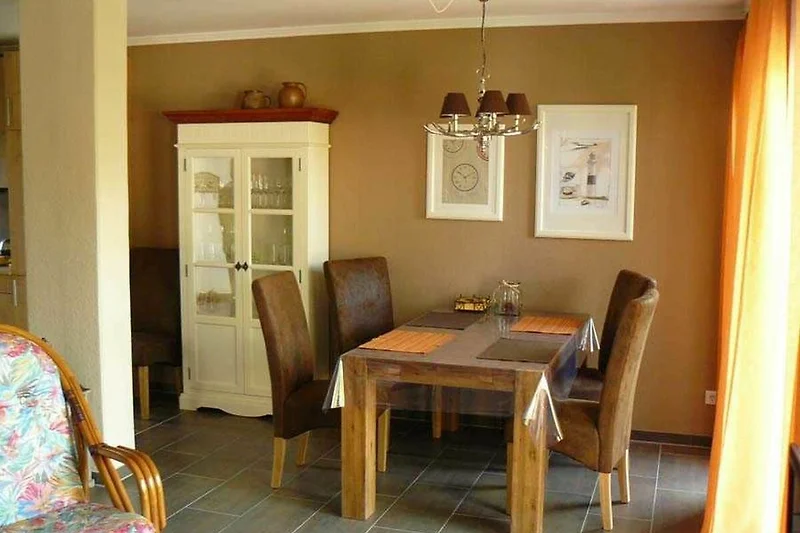 Geschmackvolle und sehr gemütliche Einrichtung im Landhausstil, grosses Rundsofa zum Chillen, EG mit hochwertigen Fliesen, Gäste-WC und Bad (WC und Dusche) raumhoch gefliest (Bad mit Fussbodenheizung), OG Schlafzimmer mit Laminat, alle Fenster mit Rollos