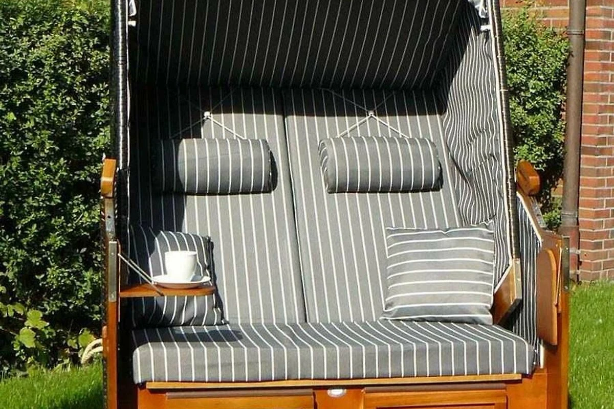 Bollerwagen, Spielzeug für drinnen und draussen. Grosse Terrasse mit Strandkorb und Gartenmöbel für 5 Personen + 2 Liegen, Fahrradhütte, W-LAN