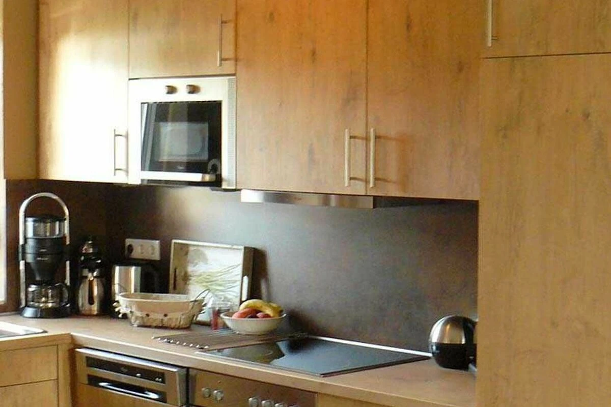 Küche mit Vollausstattung: Geschirrspüler, Ceran-Feld, Backofen, Dunstabzugshaube, Mikrowelle, grosser Kühlschrank mit Gefrierfach, Kaffeemaschine, Senseo-Automat, Wasserkocher, Mixer, Eierkocher.