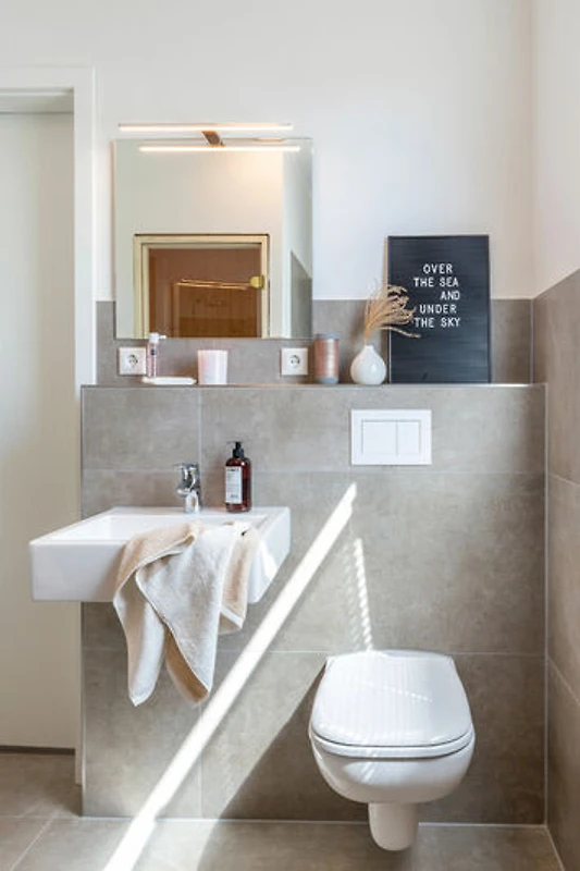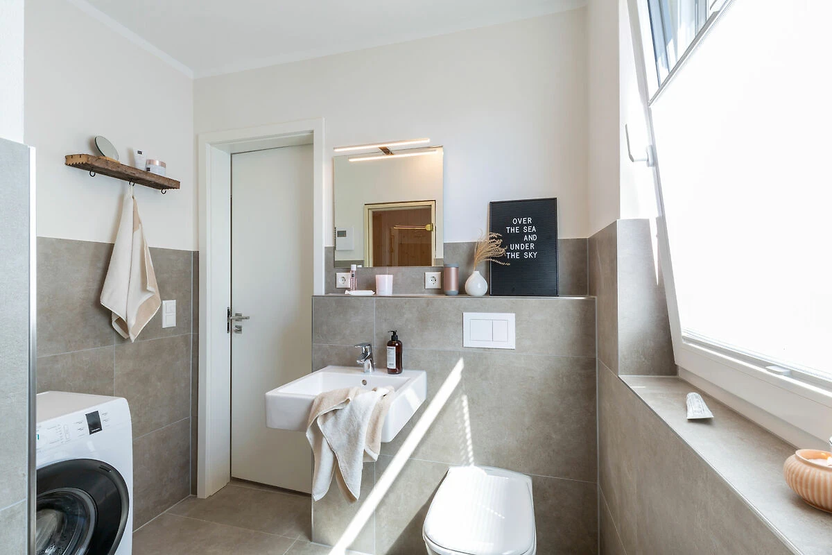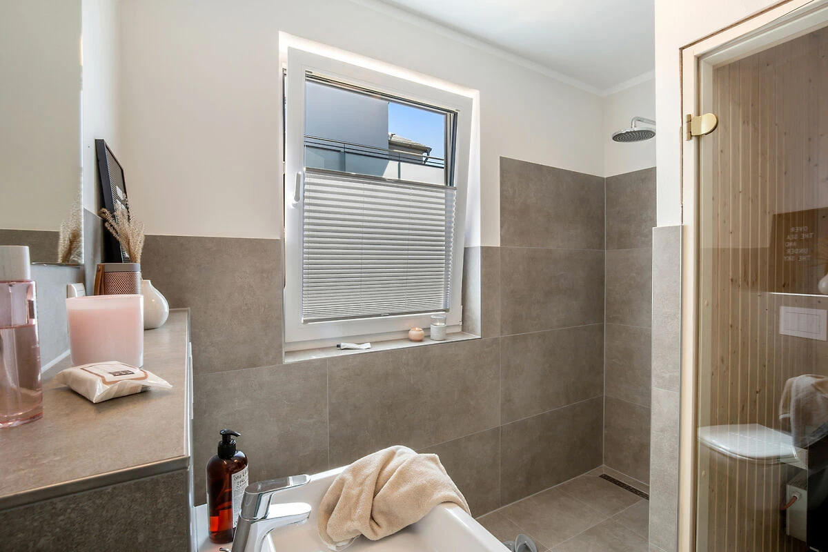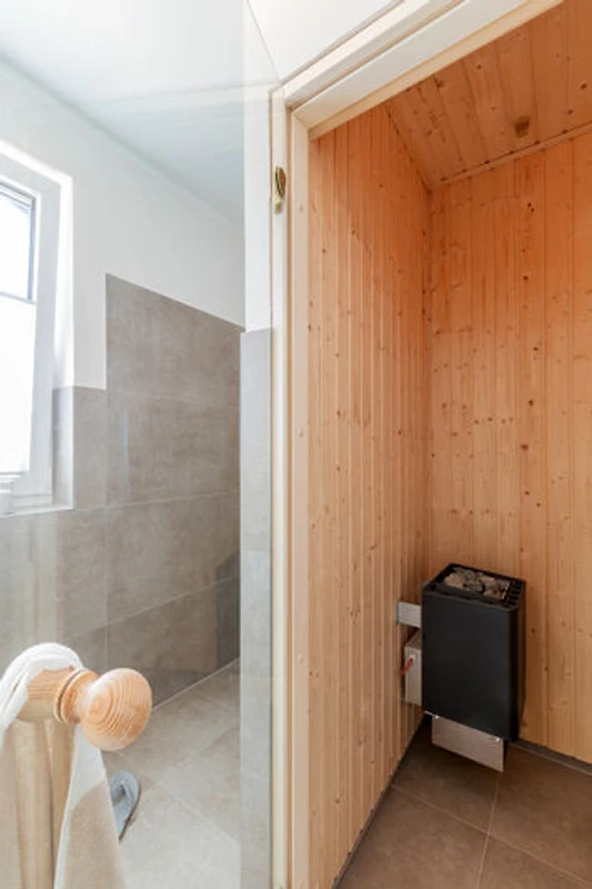 Das Duschbad ist mit einer ebenerdigen Dusche und einer Sauna ausgestattet. Eine Waschmaschine steht Ihnen auch kostenfrei zur Verfügung.