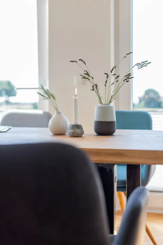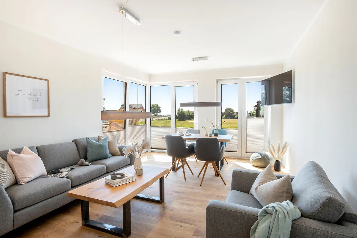 Die Ferienwohnung wird modern und exklusiv eingerichtet und verfügt über einen Wohn- / Essbereich mit schönen Sitzgelegenheiten, einen Esstisch sowie einen SAT-TV.