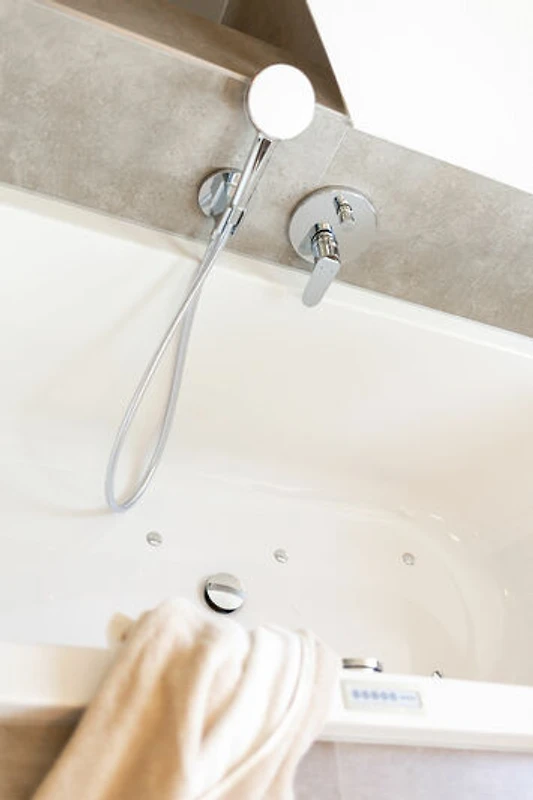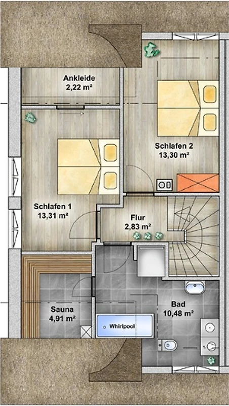 Im Dachgeschoss gibt es ebenfalls ein Badezimmer mit ebenerdiger Dusche, Sauna und Badewanne mit Whirlpool-Funktion.