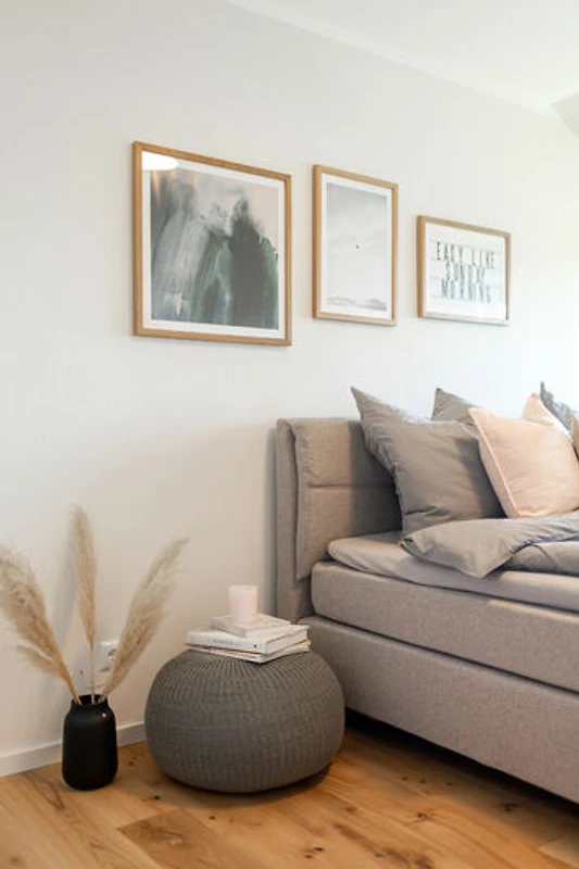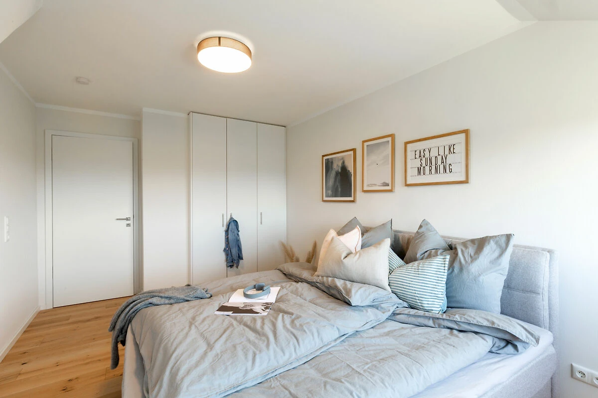 In der DHH finden Sie drei Schlafräume, welche jeweils mit einem Boxspringbett (es werden grosse Bettlaken 180 x 200 cm benötigt!) ausgestattet sind. Ein Schlafzimmer befindet sich im Erdgeschoss (Seniorengerecht), zwei weitere Schlafzimmer sind im Obergeschoss.