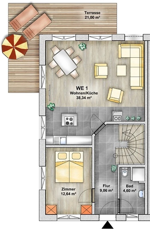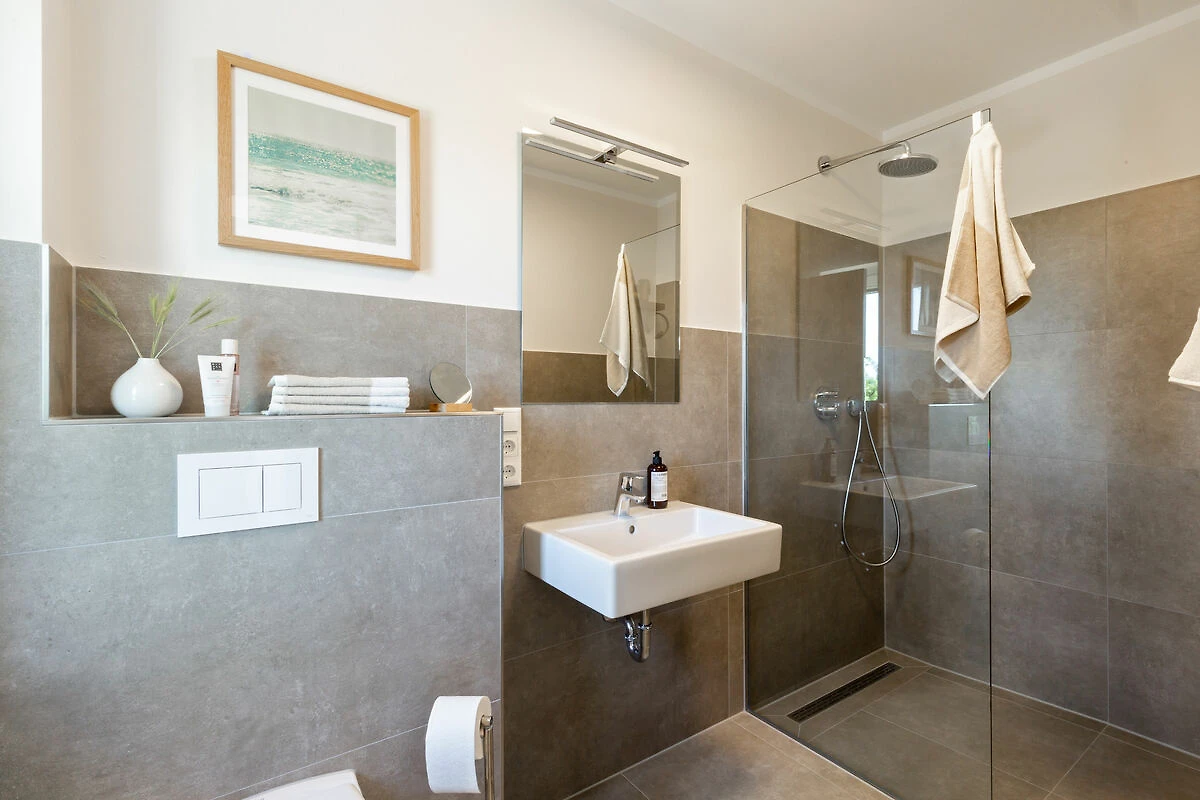 Im Erdgeschoss befindet sich ein Duschbad mit ebenerdiger Dusche und Waschmaschine.