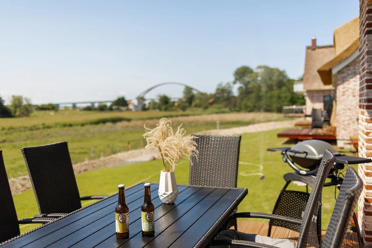 Sie haben einen Blick auf das Meer und die Fehmarnsundbrücke.