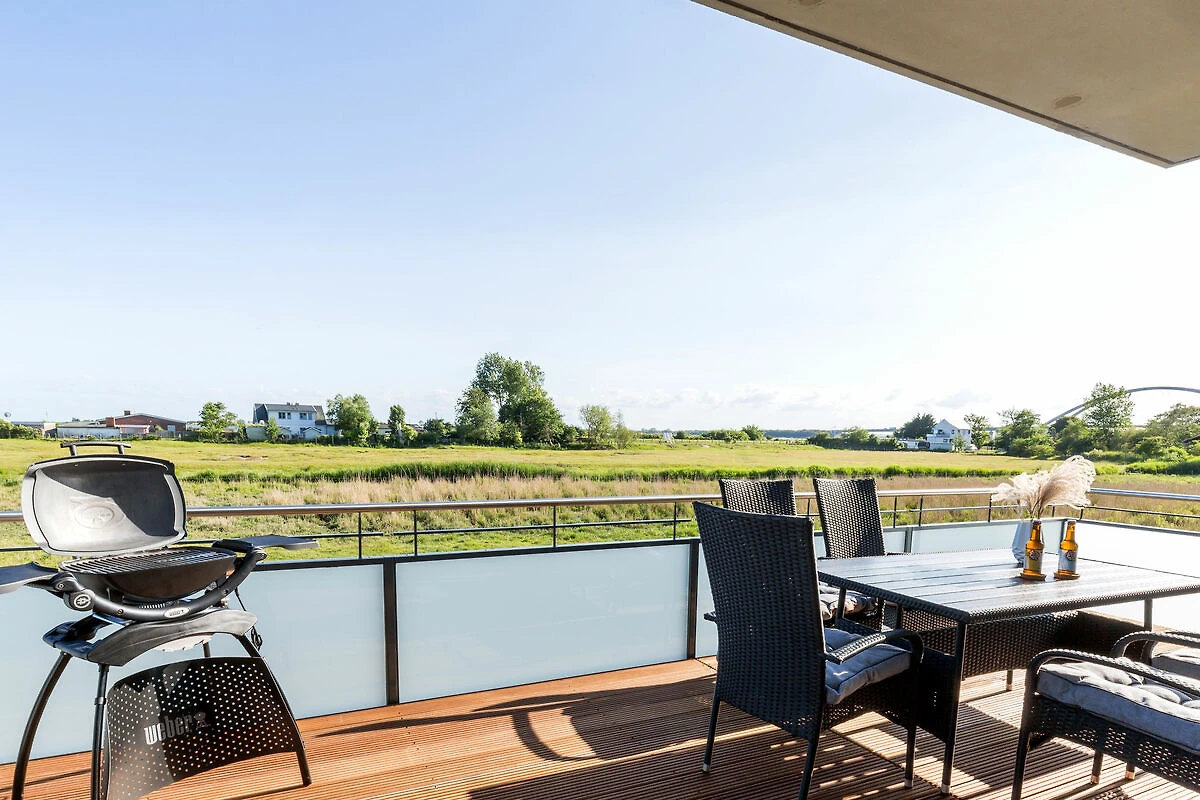 Sehr schönes Familienferienhaus in toller Umgebung. Ruhige Lage, Ausblick vom Balkon auf die Ostsee und den Fehmarnsund mit Brücke super.
