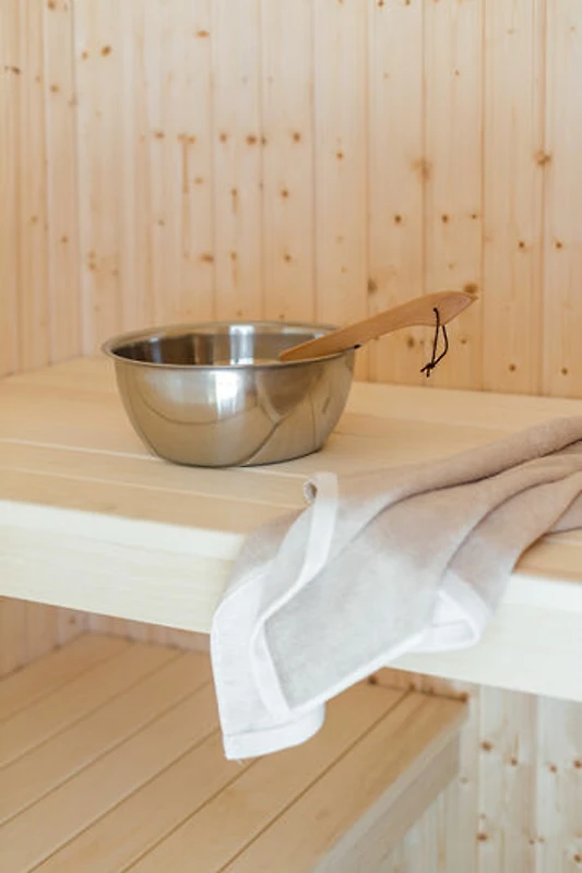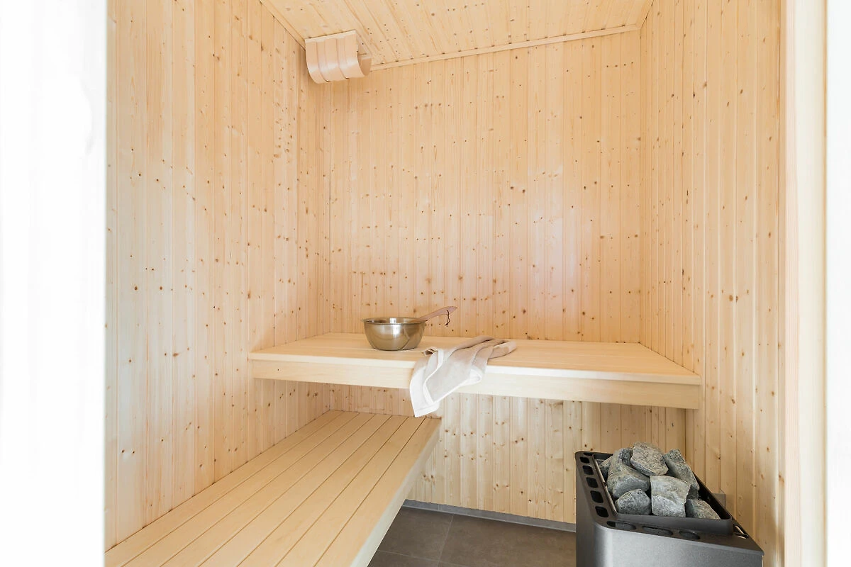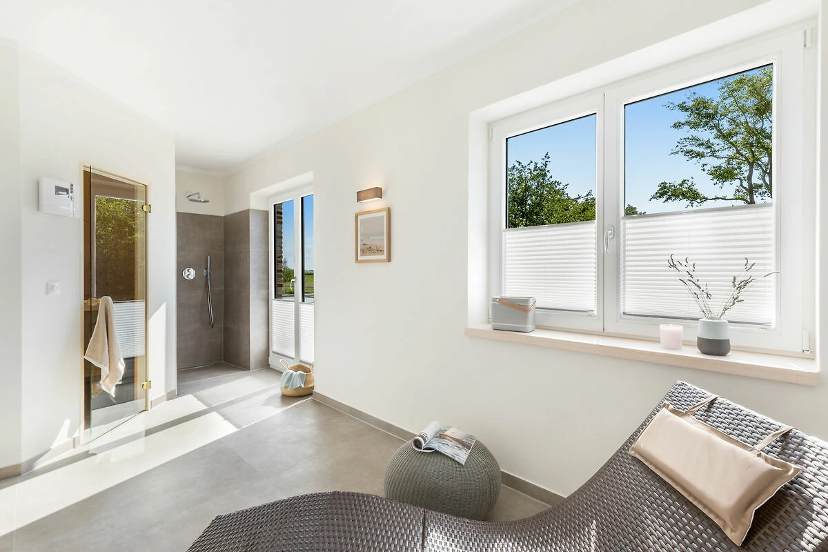 Im Erdgeschoss befindet sich ein SPA-Bereich mit Badewanne mit Whirlpool-Funktion, Sauna, Saunaliegen und ebenerdiger Dusche.