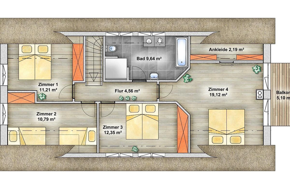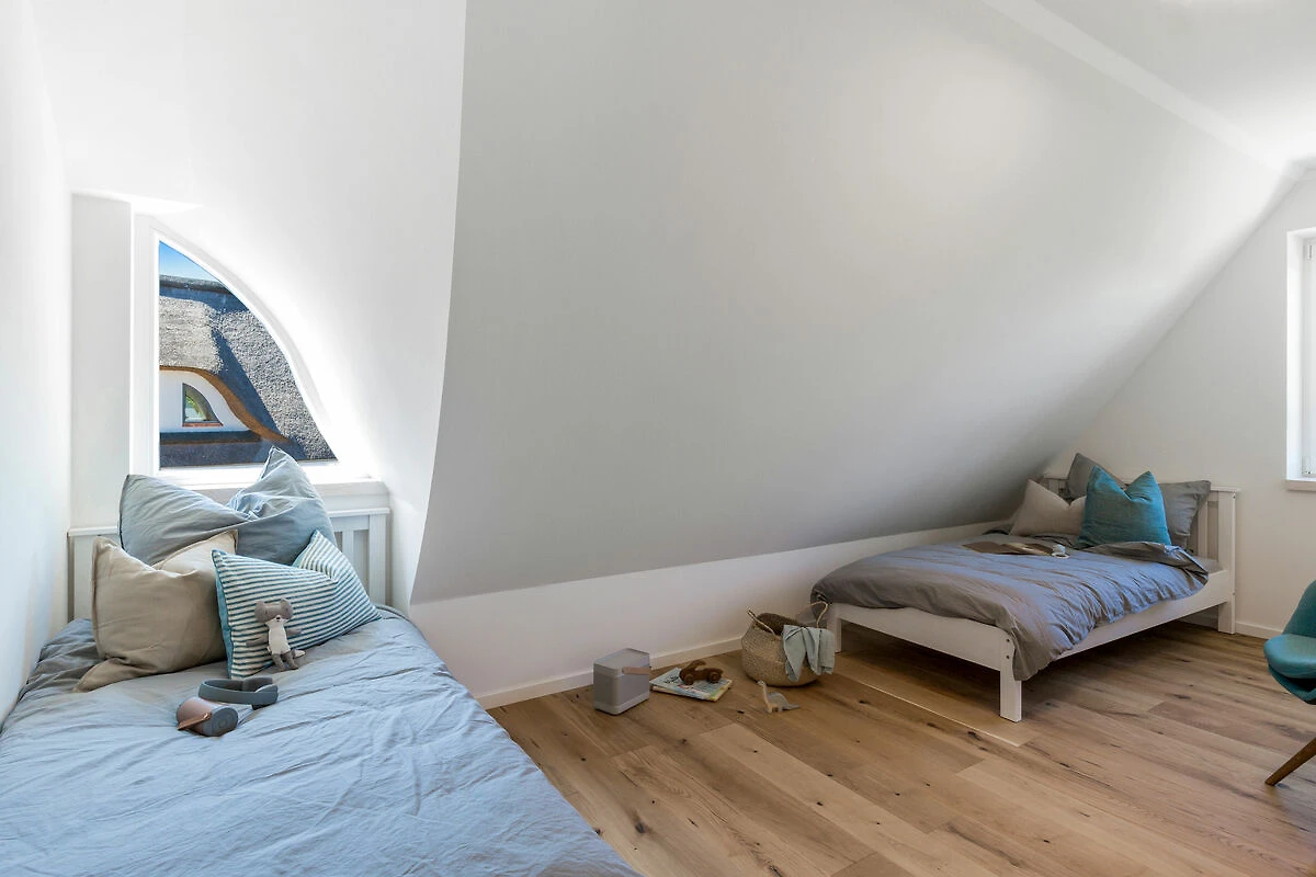 In dem Ferienhaus finden Sie fünf Schlafräume, wovon vier jeweils mit einem Boxspringbett (es werden grosse Bettlaken 180 x 200 cm benötigt!) und eins mit zwei Einzelbetten ausgestattet sind. Ein Schlafzimmer befindet sich im Erdgeschoss (Seniorengerecht), vier weitere Schlafzimmer sind im Obergeschoss.