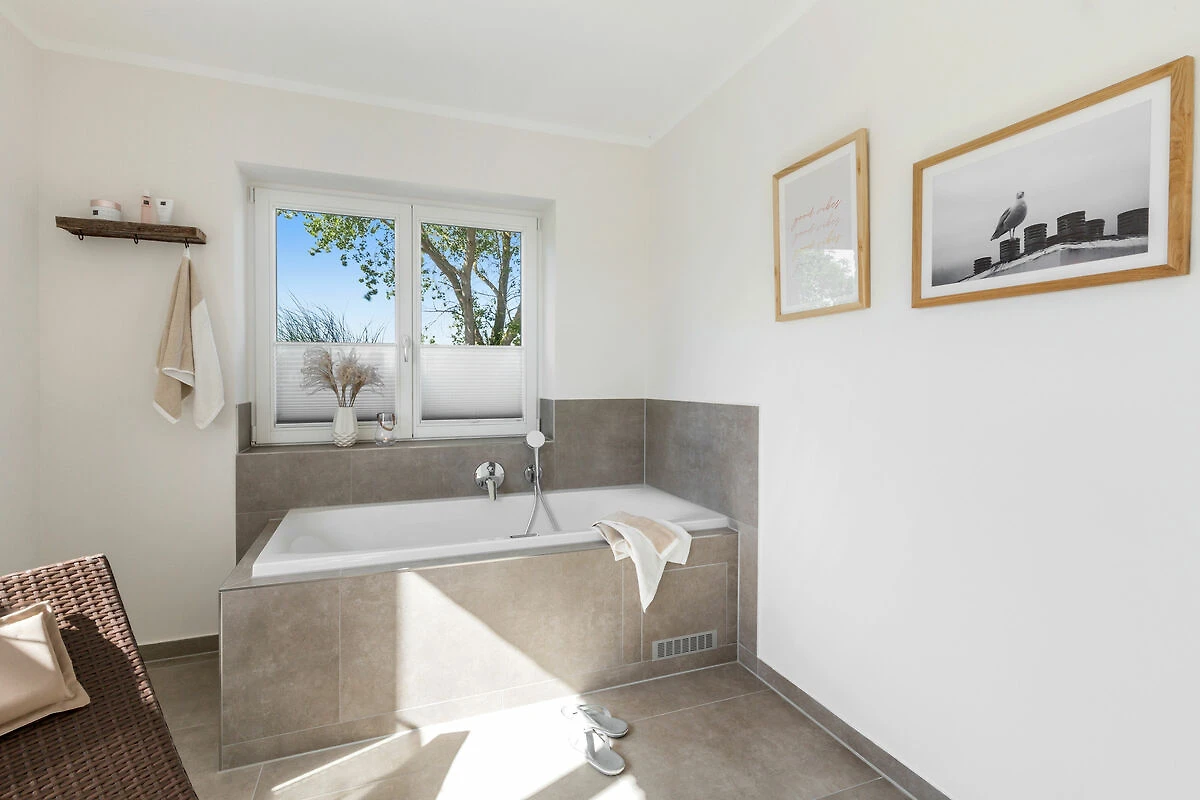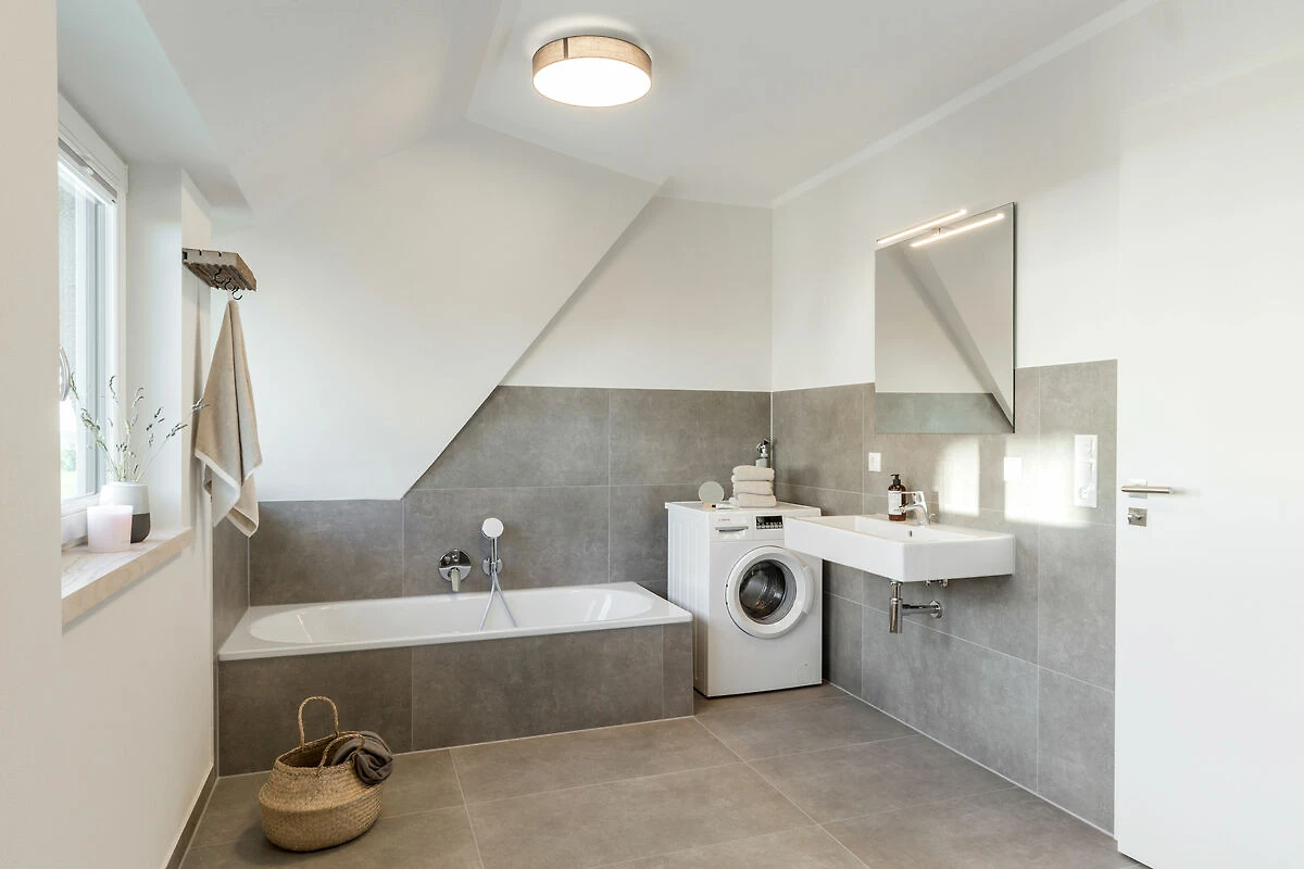 Im Dachgeschoss befindet sich ebenfalls ein Badezimmer mit ebenerdiger Dusche, Waschmaschine und Badewanne.