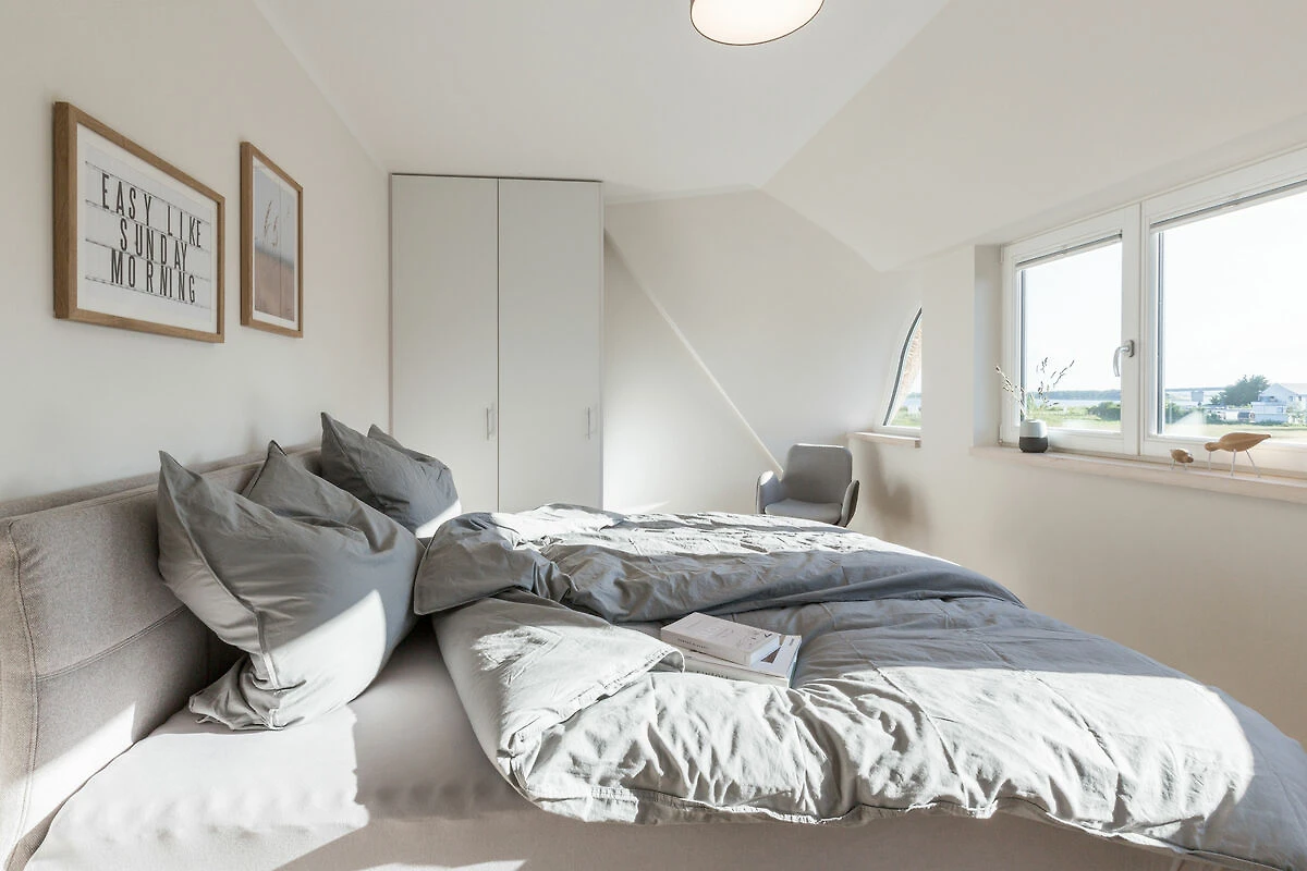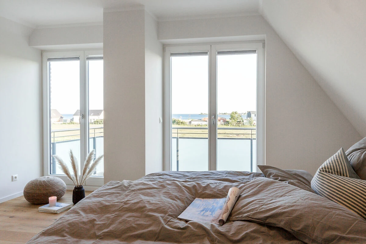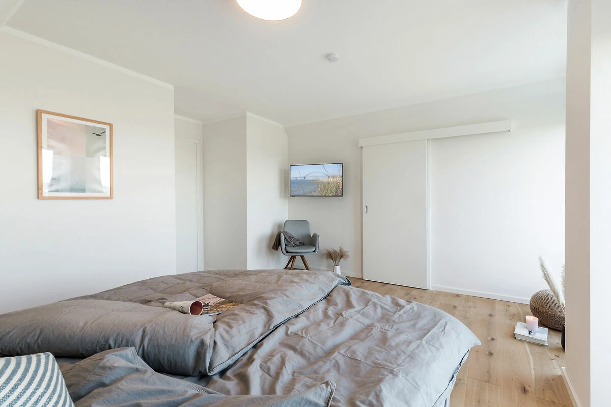 Vom grossen Schlafzimmer aus, welches zudem über einen Ankleideraum verfügt, können Sie auf den Balkon gehen und schon direkt am Morgen das Rauschen der Wellen hören.