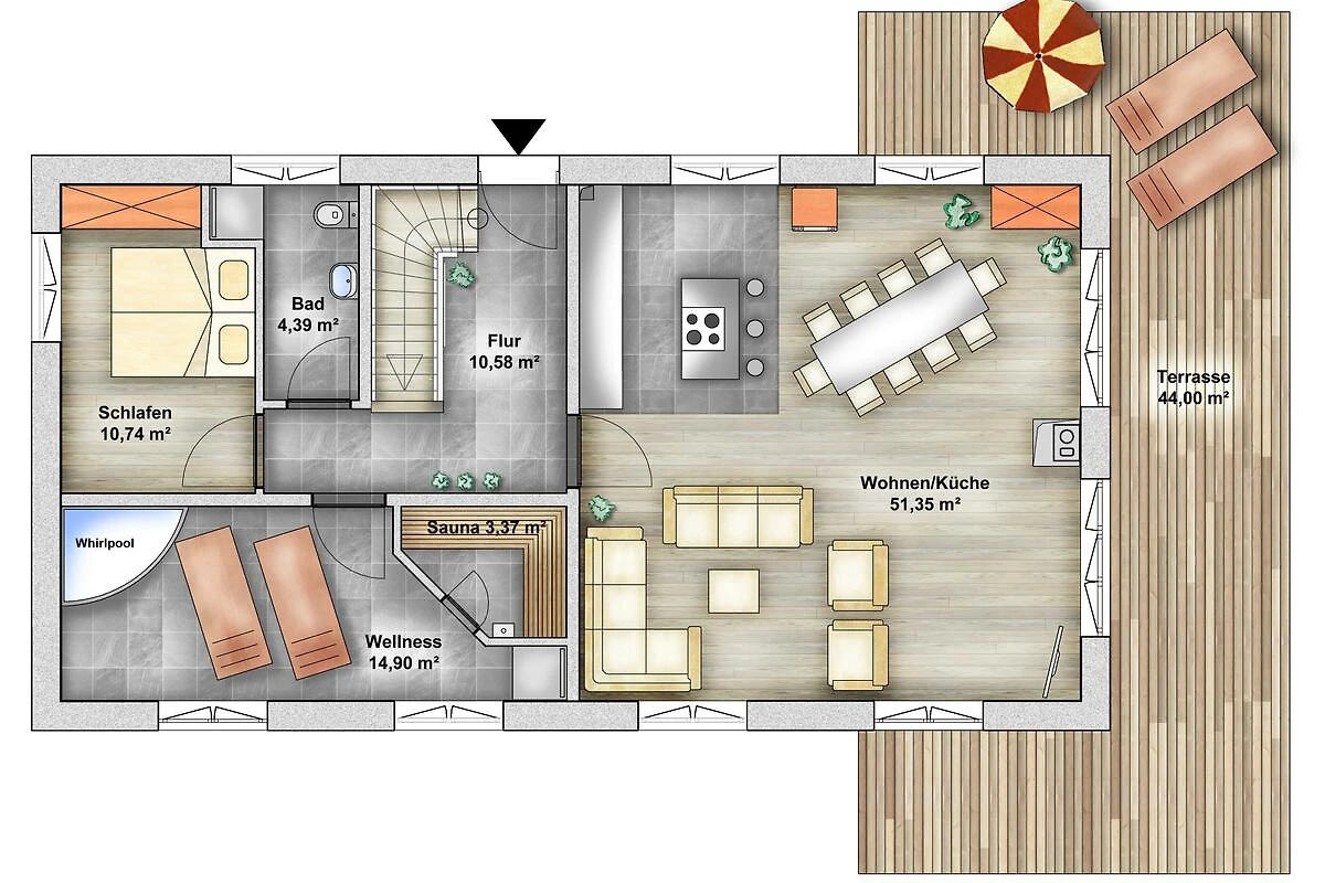Das EFH wird modern und exklusiv eingerichtet und verfügt über einen grossen Wohn- / Essbereich mit schönen Sitzgelegenheiten, einen grossen Esstisch sowie einen SAT-TV und Kaminofen.
