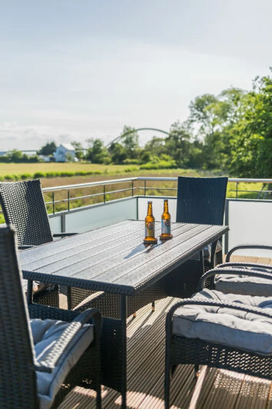 Sie haben einen Blick auf das Meer und die Fehmarnsundbrücke.