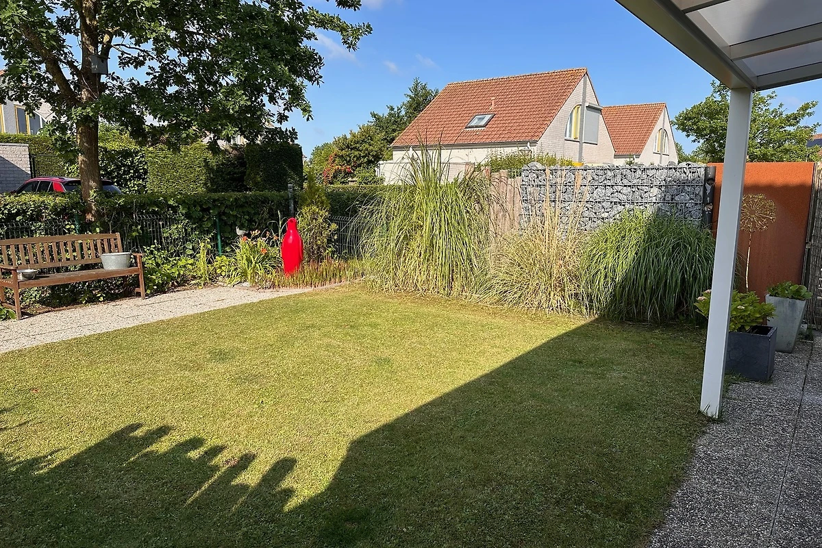 Der nach Süden ausgerichtete Garten ist vollständig eingezäunt und bietet ideale Voraussetzungen für Sonnenanbeter. Hier können Sie von den frühen Morgenstunden bis in den späten Nachmittag die Sonne genießen. Eine überdachte, beleuchtete Terrasse mit Gartentisch, sechs Stühlen und zwei Liegen lädt zum Entspannen ein.
