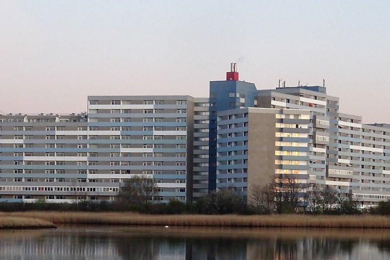 Ferienwohnung mit XL Balkon, mit Blick über den park ähnlichen Innenhof und den Binnensee zur Ostsee. Genießt beim Frühstück die phantastischen Sonnenaufgänge.
