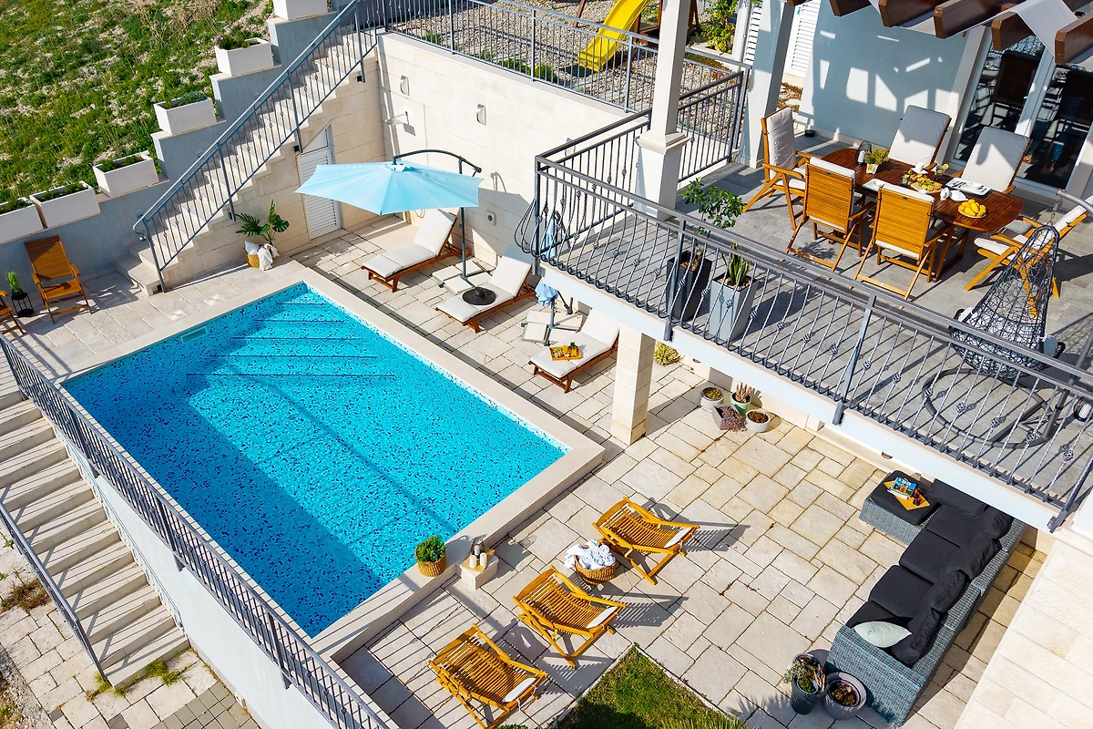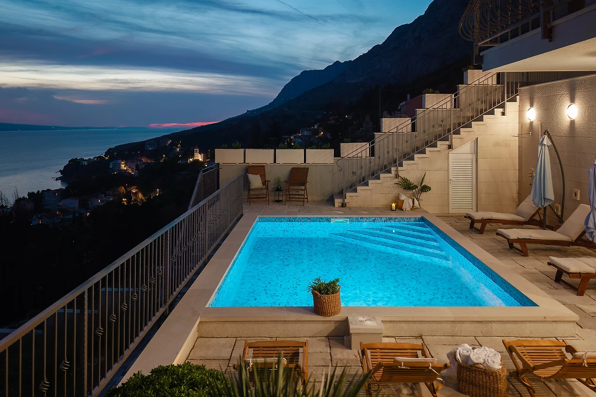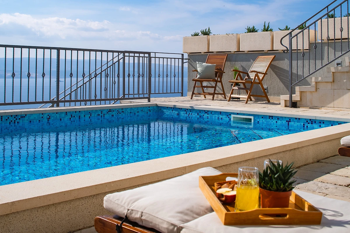 - Gehen Sie die Außentreppe hinunter zum Poolbereich, der einen privaten, 25 qm großen, beheizten Pool mit Gegenstromanlage bietet und absolute Privatsphäre gewährt. Hier finden Sie 6 Liegestühle und eine Lounge-Ecke, die sich perfekt eignet, um mit einem Glas Wein und einem guten Buch zu entspannen und dabei die spektakuläre Aussicht zu genießen.