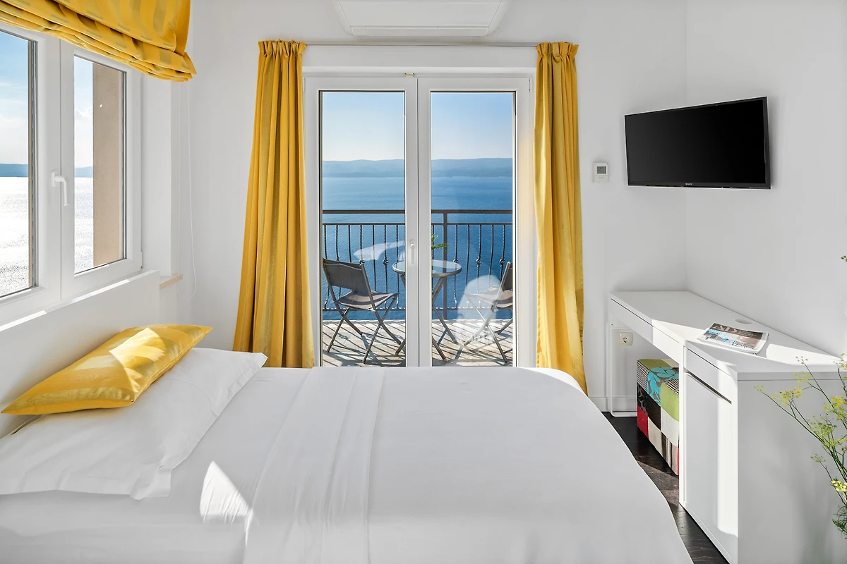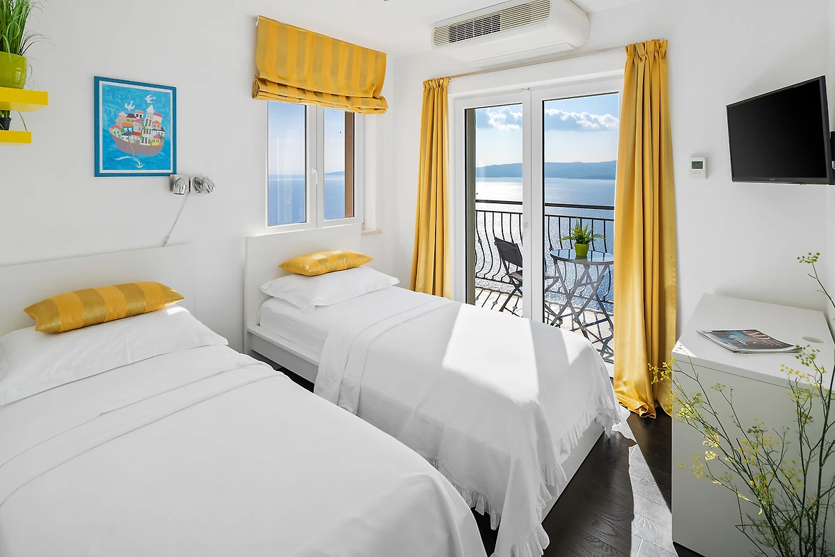 - **Schlafzimmer 3**: Zwei Einzelbetten (90cm x 200cm), ein Balkon mit offenem Meerblick, Klimaanlage und TV.