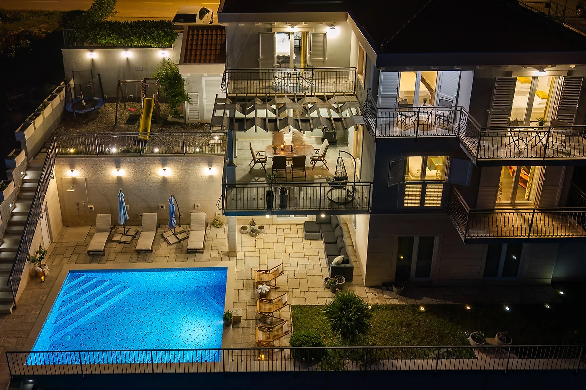 - Der Essbereich im Freien ist praktisch mit der Küche und dem Wohnzimmer verbunden und verfügt über einen überdachten Bereich mit Gasgrill sowie atemberaubenden Meer- und Inselblick, den Sie zu jeder Tages- und Nachtzeit genießen können. Direkt daneben befindet sich ein Spielplatz für Kinder mit Trampolin, einem Holzspielhaus mit Rutsche und einer Schaukel. Zur Verfügung stehen Ihnen außerdem 3 Mountainbikes. *Poolbereich:*