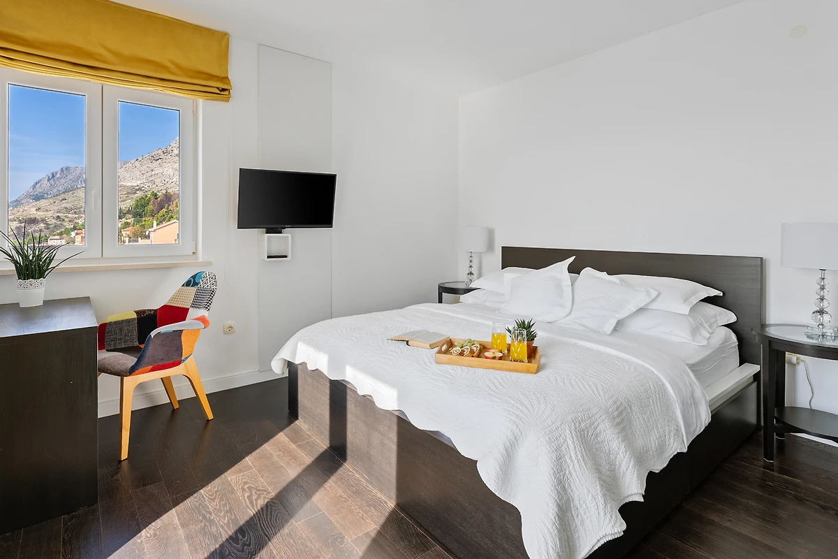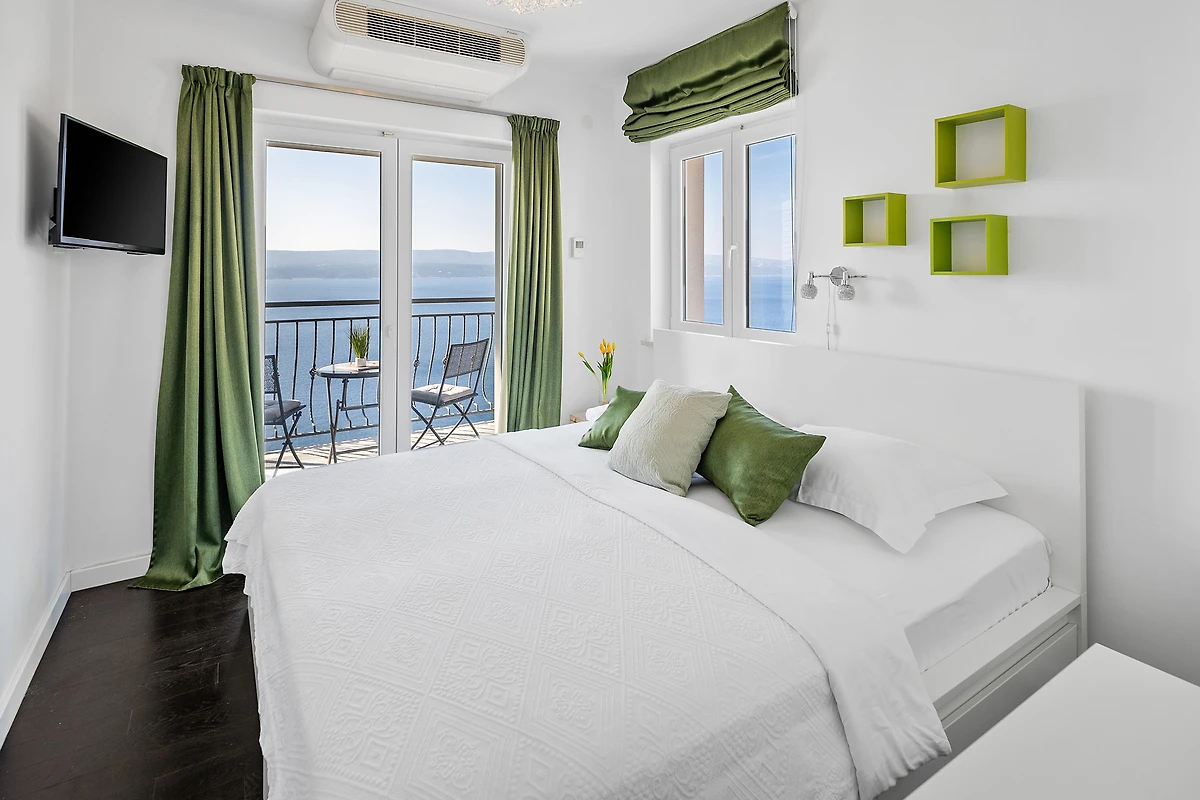 - **Schlafzimmer 1**: Hauptschlafzimmer mit einem Kingsize-Bett (180cm x 200cm), einem Balkon mit offenem Meerblick, eigenem Bad mit Dusche, Klimaanlage und TV. - **Schlafzimmer 2**: Queensize-Bett (160cm x 200cm), ein Balkon mit offenem Meerblick, Klimaanlage und TV.