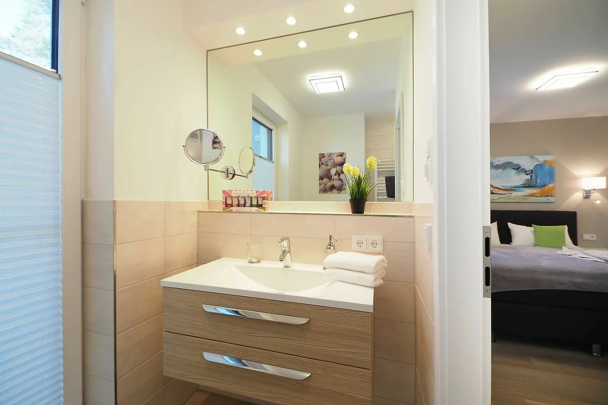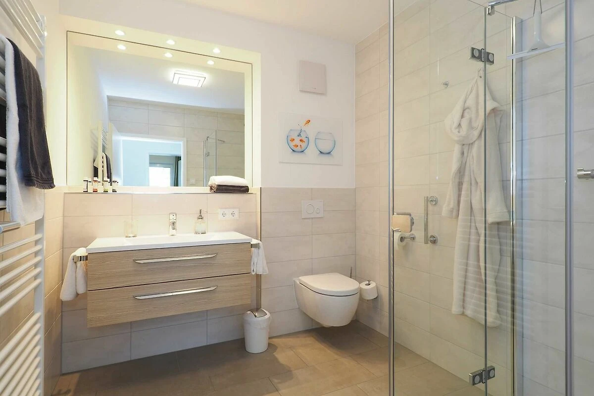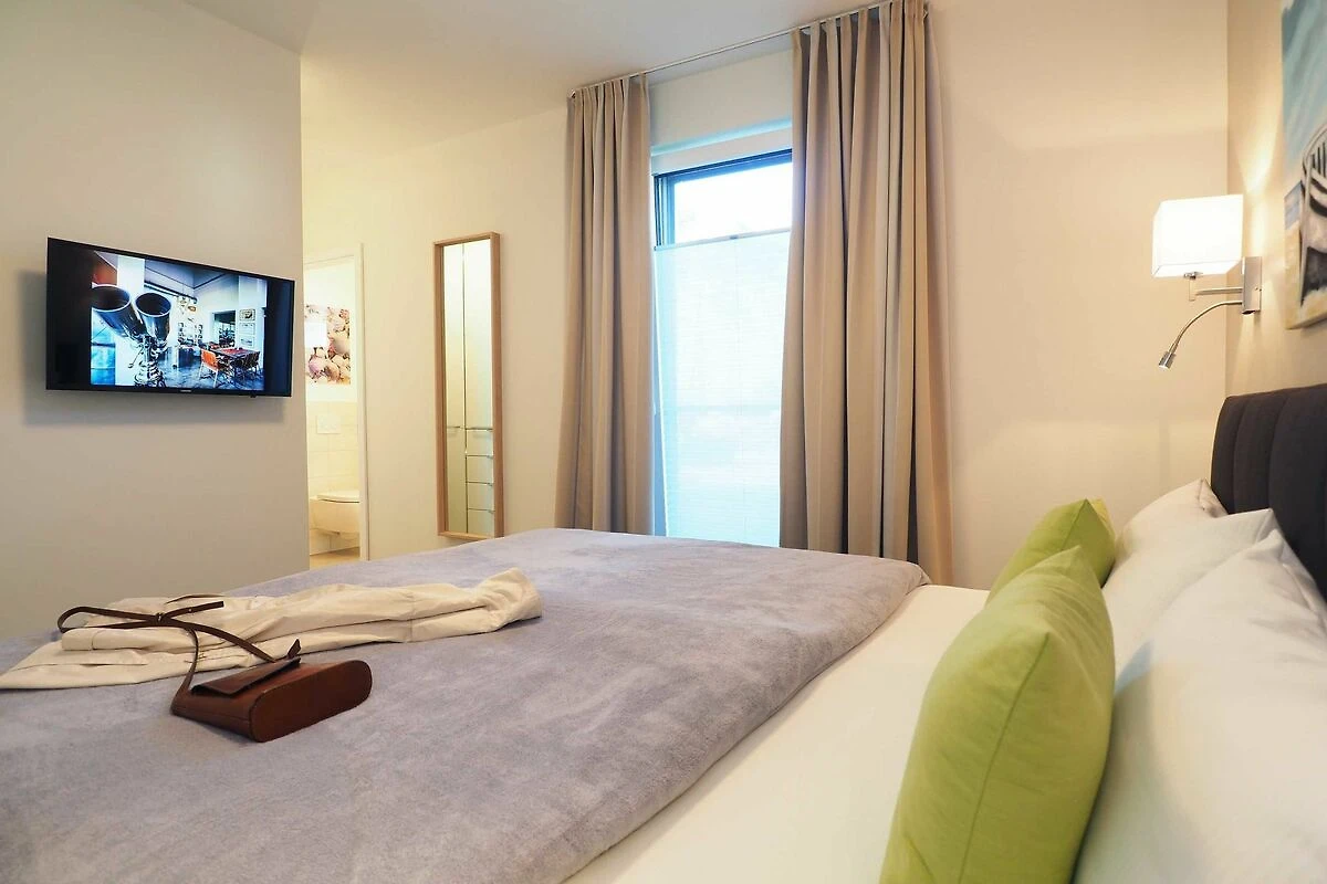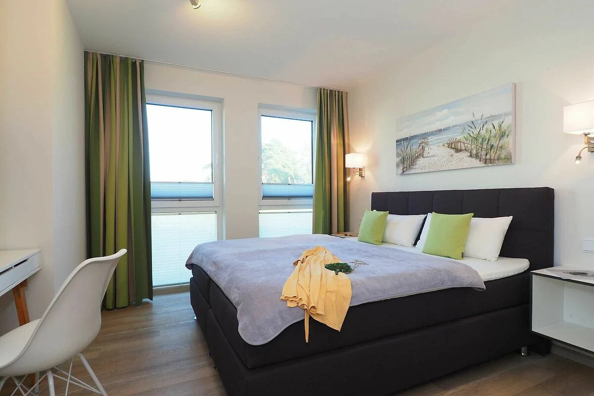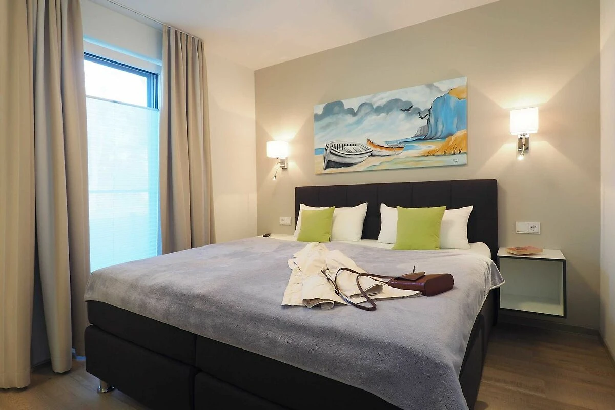 Diese luxuriöse 4-Zimmer-Wohnung im Erdgeschoss von Haus 5 mit Platz für maximal 6 Personen verfügt über eine Wohnfläche von 100 m² und hat 3 Schlafzimmer sowie 2 voll ausgestattete Duschbäder. Die grosse Sonnenterrasse mit 21 m² liegt in idealer Süd-Ausrichtung. Die Wohnung ist modern eingerichtet mit offenem Wohn-Essbereich, grossem Esstisch, Ledersofa sowie Smart-TV (inkl. Sky-Abo). Die hochwertig ausgestattete Küche, offen zum Wohnbereich, lässt keine Wünsche offen. Erholsamer Schlaf in den beiden Schlafzimmern mit Boxspringbetten und Smart-TV ist garantiert. Im dritten Schlafzimmer befindet sich ein bequemes Schlafsofa (Liegefläche: 1,60 x 2,00 m), Schreibtisch und Smart-TV. Das Badezimmer en Suite ist mit einer begehbaren Dusche ausgestattet. Auf der grossen, überdachten Sonnenterrasse mit Essgruppe und jeweils zwei Relax-Sesseln, Fusshockern, Sonnenschirm und Sonnenliegen können Sie die Seele baumeln lassen.