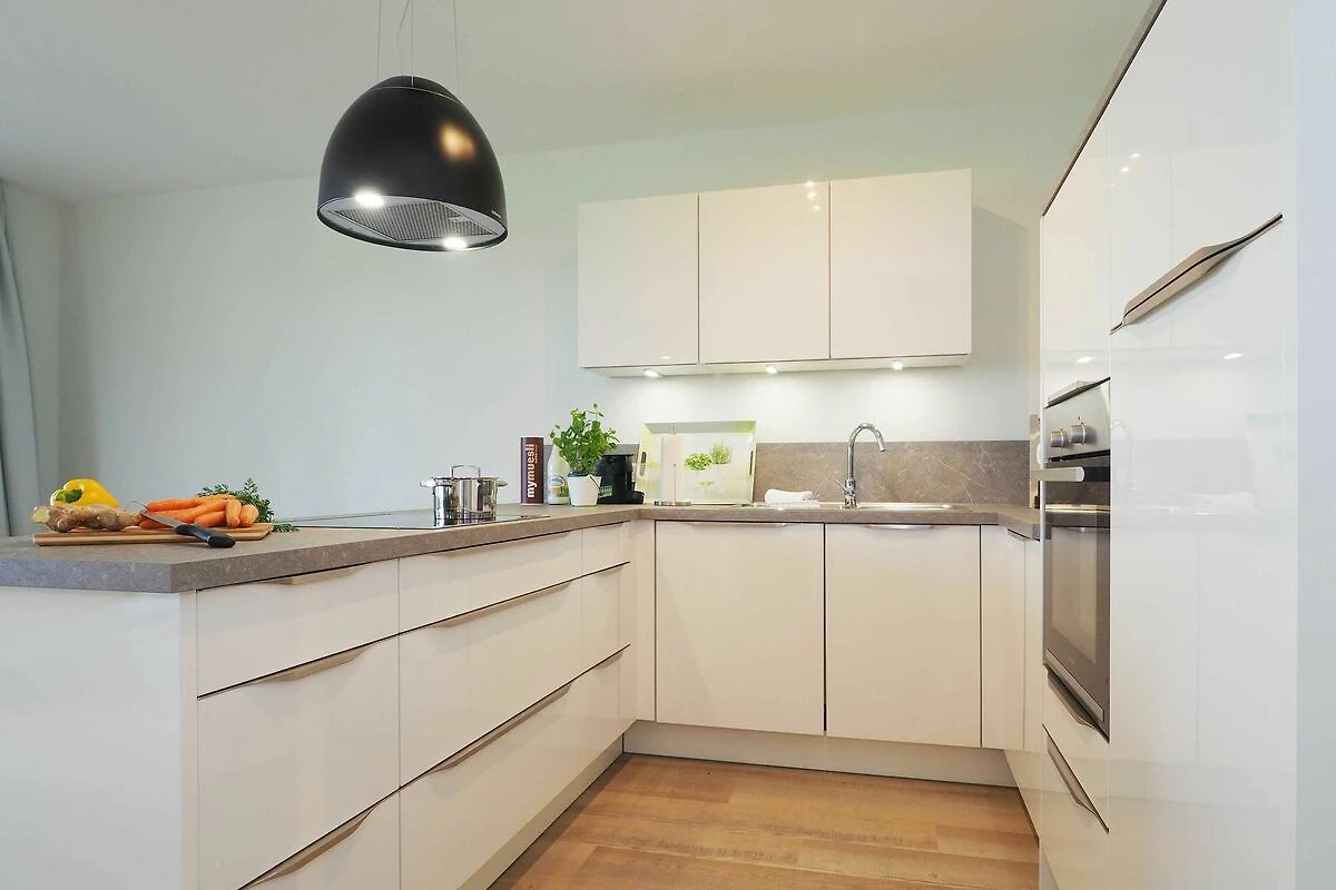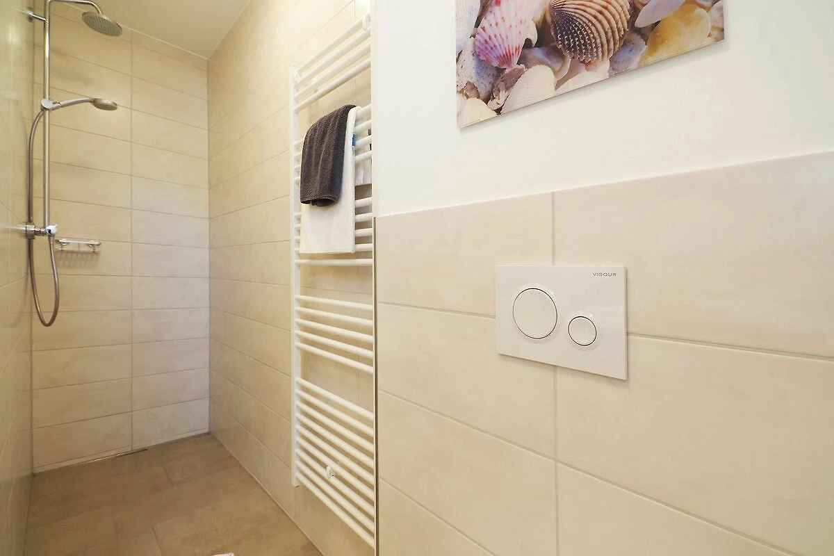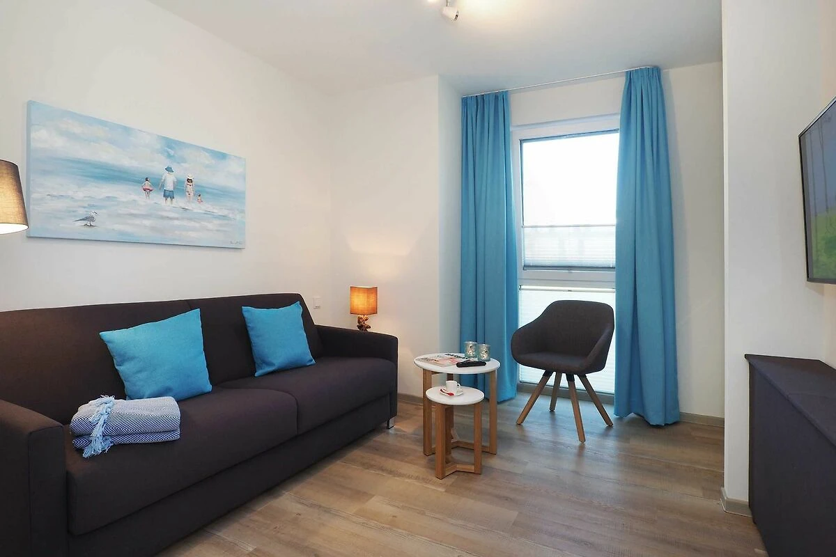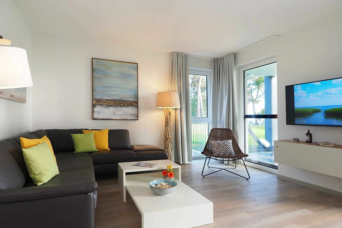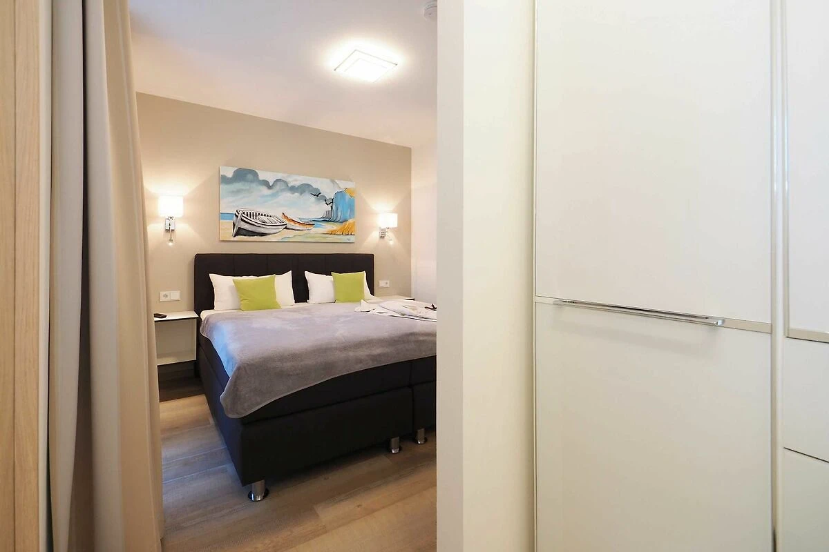 Diese luxuriöse 4-Zimmer-Wohnung im Erdgeschoss von Haus 5 mit Platz für maximal 6 Personen verfügt über eine Wohnfläche von 100 m² und hat 3 Schlafzimmer sowie 2 voll ausgestattete Duschbäder. Die grosse Sonnenterrasse mit 21 m² liegt in idealer Süd-Ausrichtung. Die Wohnung ist modern eingerichtet mit offenem Wohn-Essbereich, grossem Esstisch, Ledersofa sowie Smart-TV (inkl. Sky-Abo). Die hochwertig ausgestattete Küche, offen zum Wohnbereich, lässt keine Wünsche offen. Erholsamer Schlaf in den beiden Schlafzimmern mit Boxspringbetten und Smart-TV ist garantiert. Im dritten Schlafzimmer befindet sich ein bequemes Schlafsofa (Liegefläche: 1,60 x 2,00 m), Schreibtisch und Smart-TV. Das Badezimmer en Suite ist mit einer begehbaren Dusche ausgestattet. Auf der grossen, überdachten Sonnenterrasse mit Essgruppe und jeweils zwei Relax-Sesseln, Fusshockern, Sonnenschirm und Sonnenliegen können Sie die Seele baumeln lassen.
