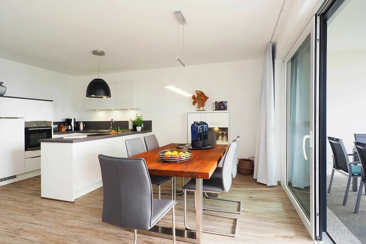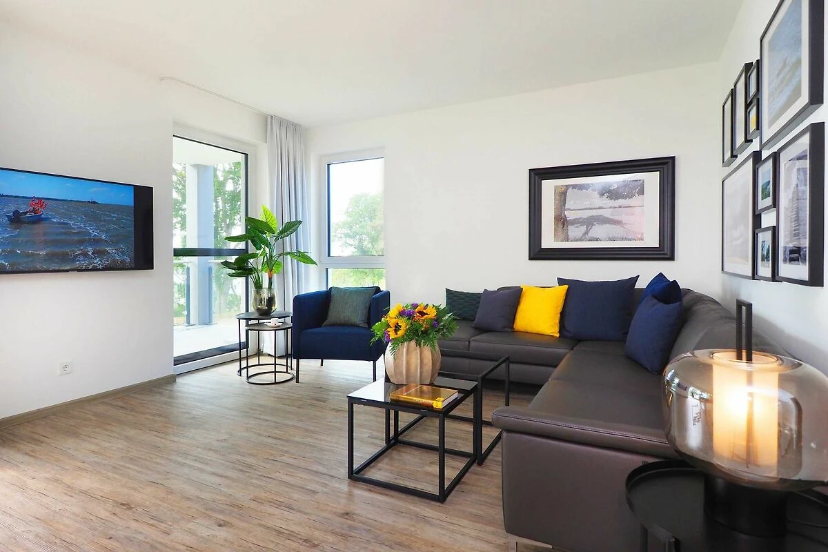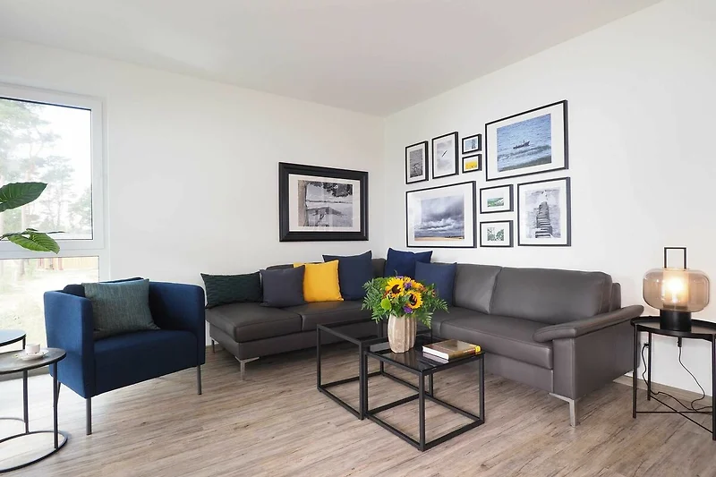 Diese luxuriöse 3-Zimmer-Wohnung im ersten Obergeschoss von Haus 5 (Aufzug vorhanden) mit Platz für maximal 4 Personen sowie einem Kleinkind bis 2 Jahre im Babybett verfügt über eine Wohnfläche von 101 m² und hat 2 Schlafzimmer sowie 2 voll ausgestattete Duschbäder. Die grosse Sonnenterrasse mit 17 m² liegt in idealer Ausrichtung. Die Wohnung ist modern eingerichtet mit offenem Wohn-Essbereich, grossem Esstisch, Ledersofa sowie Smart-TV (inkl. Sky-Abo). Die hochwertig ausgestattete Küche, offen zum Wohnbereich, lässt keine Wünsche offen. Erholsamer Schlaf in den beiden Schlafzimmern mit Boxspringbetten und Smart-TV ist garantiert. Das Badezimmer en Suite ist mit einer begehbaren Dusche ausgestattet. Auf der grossen, überdachten Sonnenterrasse mit Essgruppe und jeweils zwei Relax-Sesseln, Fusshockern sowie einem Sonnenschirm können Sie die Seele baumeln lassen.