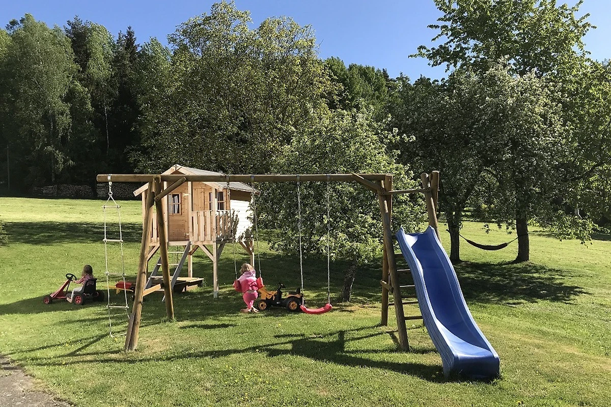 Die Liege- und Obstbaumwiese lädt zum Sonnenbaden, Relaxen und Spielen ein. Ein kleiner Spielplatz mit Stelzenhaus, Sandkasten, Rutsche und Schaukeln für die Jüngsten befinden sich neben dem Haus.