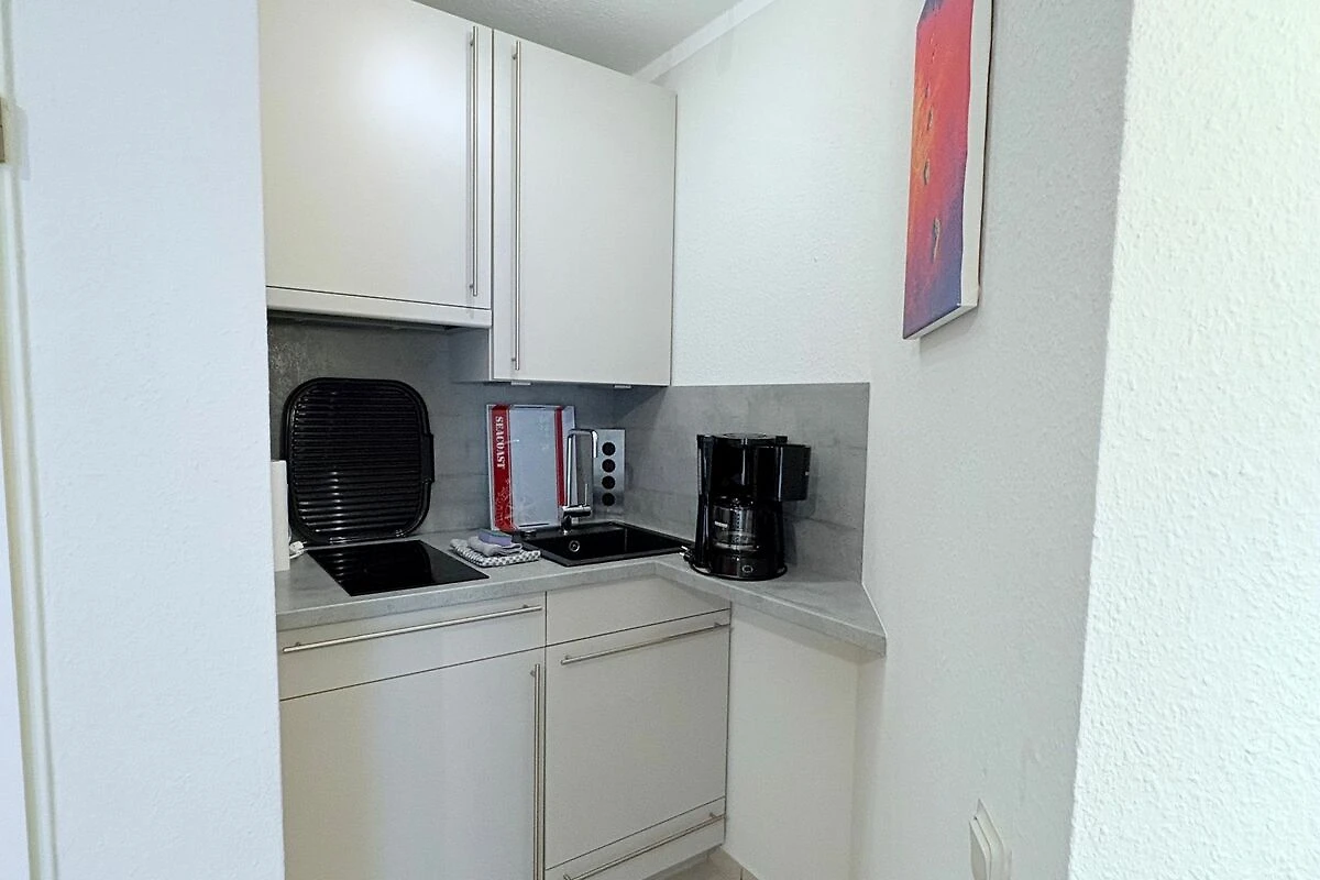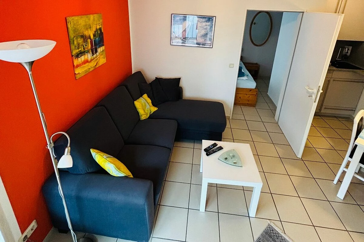 Die Wohnung ist aufgeteilt in einen gemütlichen Wohn- und Essbereich mit integrierter Küchenzeile, ausgestattet mit Ceranfeld, Kaffeemaschine und Toaster. Ein grosses Sofa lädt zum Entspannen ein. Das separate Schlafzimmer mit Doppelbett sorgt für erholsame Nächte. Ein modernes Badezimmer mit Dusche und WC ergänzt die Ausstattung.