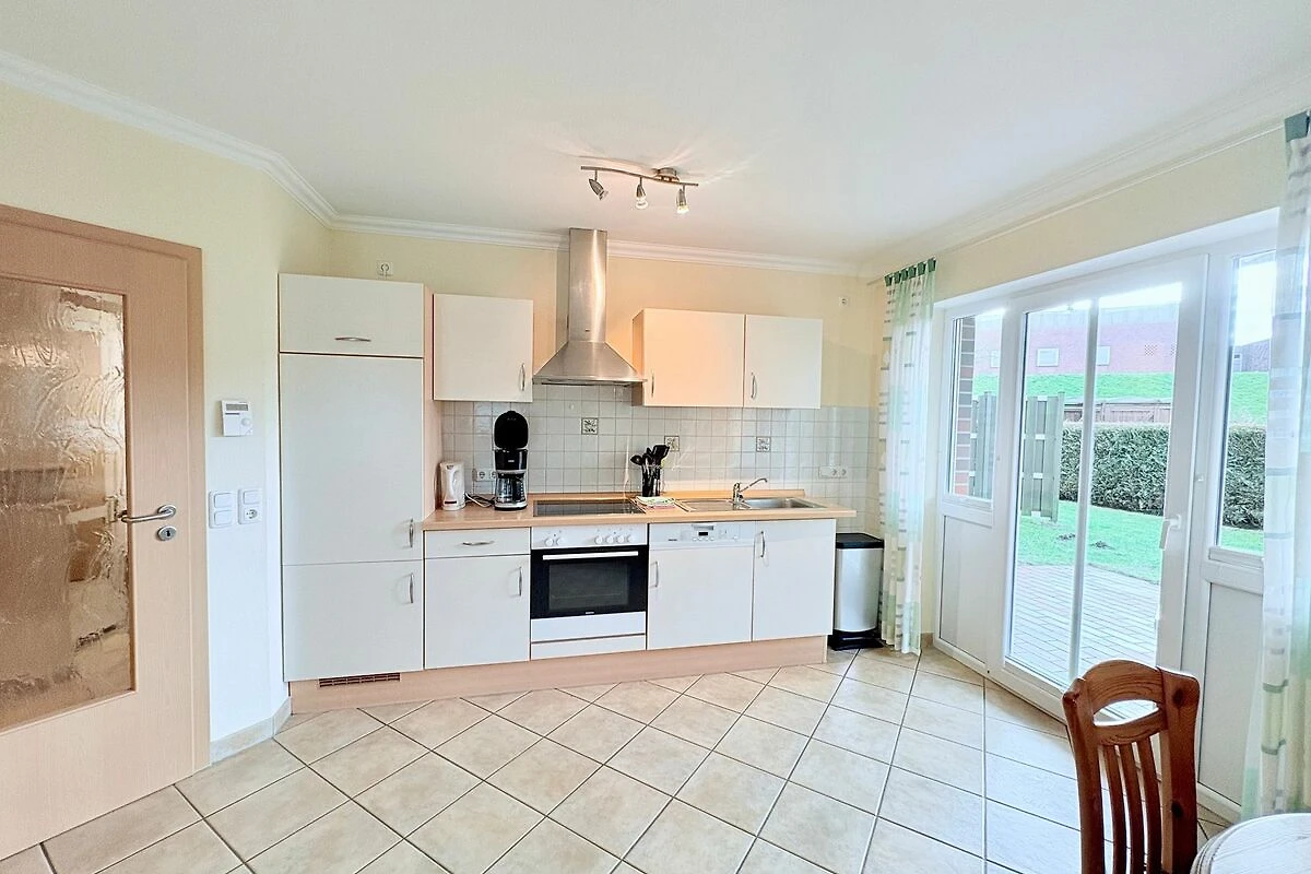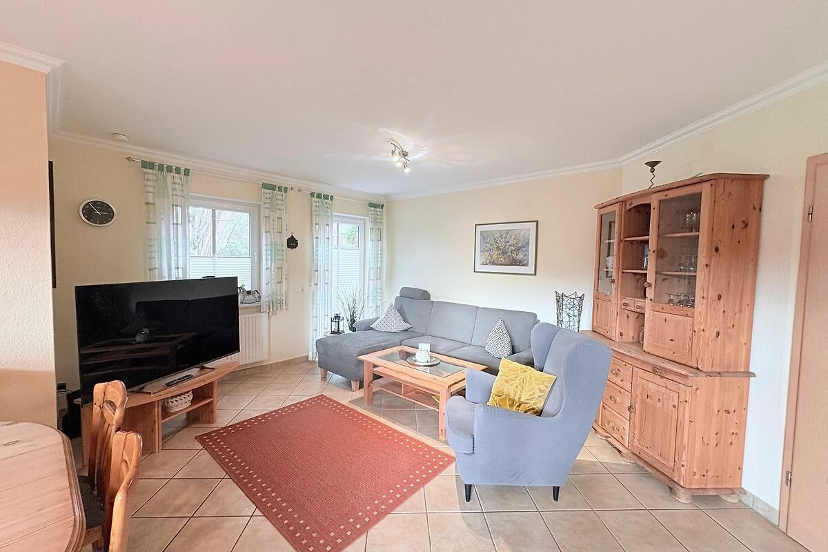 Das Herzstück der Wohnung ist die grosse, offene Wohnküche mit gemütlicher Sofaecke und TV ideal für gesellige Abende nach einem langen Strandtag. Zwei Schlafzimmer bieten Platz für bis zu vier Personen: eines mit komfortablem Boxspringbett, das andere mit zwei Einzelbetten und eigenem Fernseher. Die teilüberdachte Terrasse mit privatem Rasen, geschützt durch Hecke und Zaun, lädt zum Entspannen und Draussensitzen ein. Für Familien mit Kleinkind steht ein Kinderreisebett bereit und Auto sowie Fahrräder finden auf dem Gelände sicher ihren Platz.