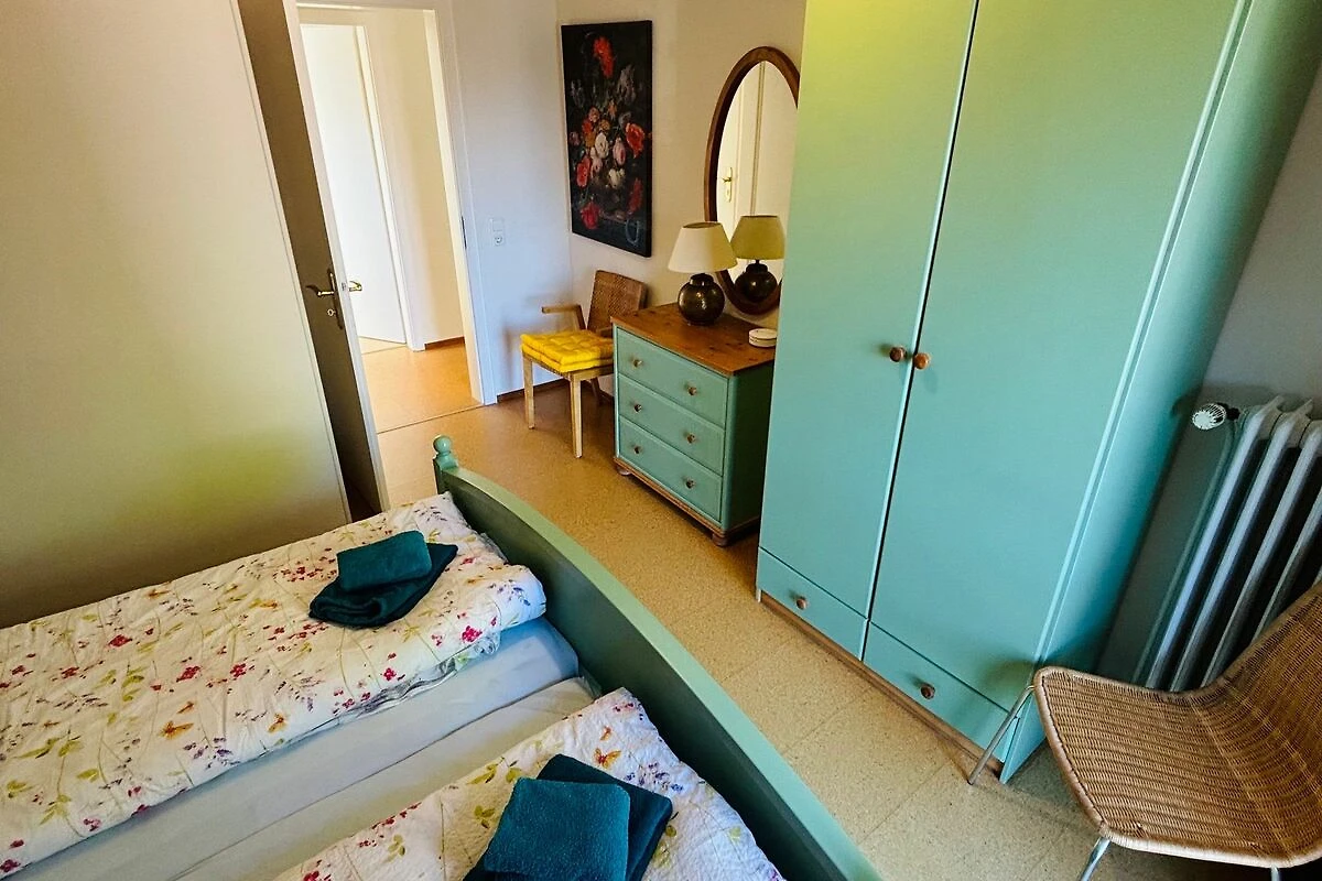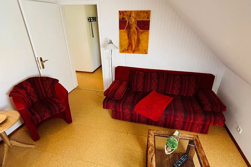 Herzlich willkommen in unserer einladenden Ferienwohnung im 1. Stock! Mit grosszügigen 49m² bietet sie den idealen Rückzugsort für 2 Personen. Das Wohnzimmer mit einem bequemen Schlafsofa und das Schlafzimmer mit bezogenen Betten sind für höchsten Komfort mit stilvollen Korkböden ausgestattet.