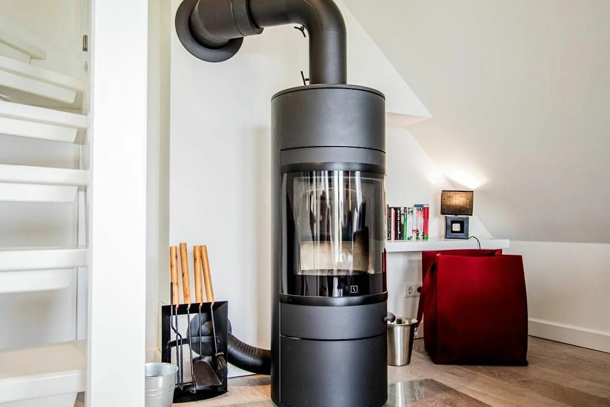 Ein helles Wohnzimmer mit grosser Fensterfront zum möblierten Balkon, Kaminofen. TV SAT/Kabel, Radio, Sofa.