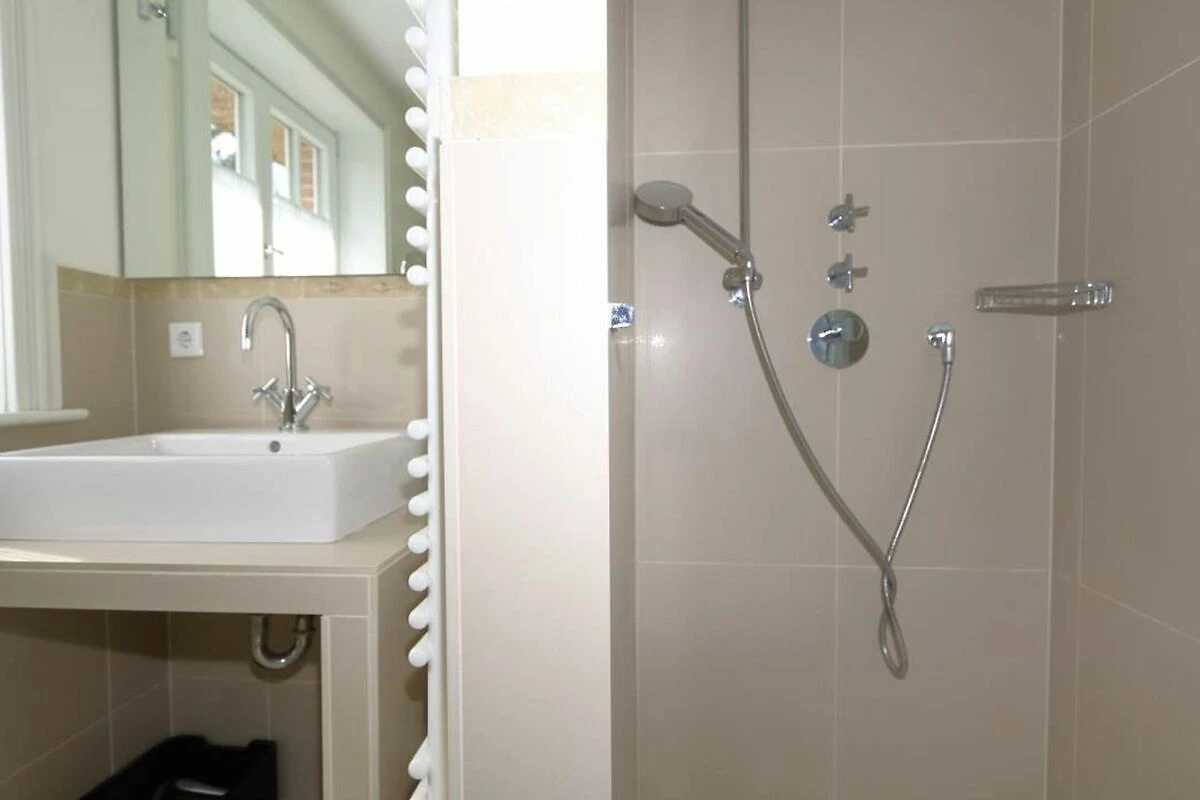 Waschbecken, Fussbodenheizung, Spiegel, Dusche (bodengleich), Ausreichend Handtücher und Vorleger.