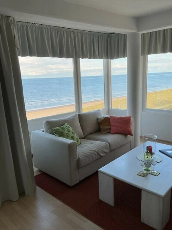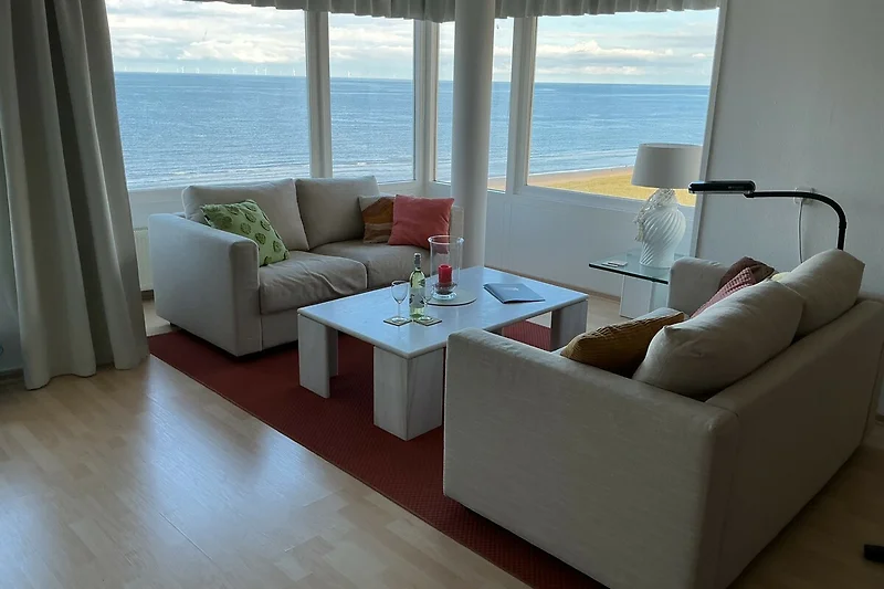 Vom Wohnzimmer aus genießen Sie den Ausblick auf den Strand, das Meer und die Promenade.